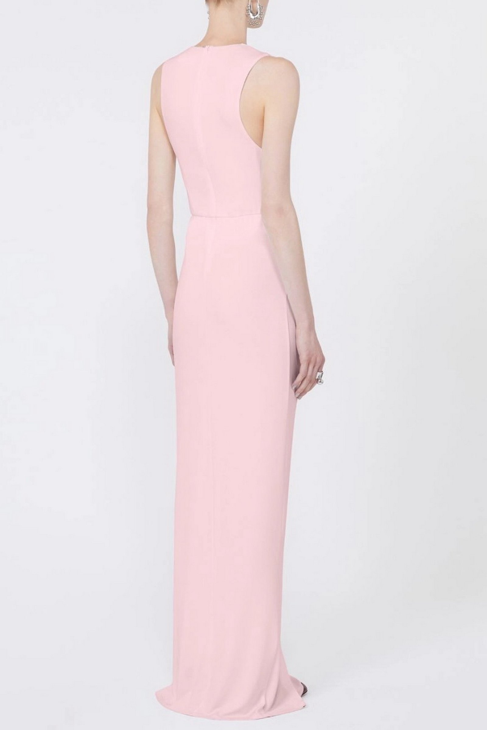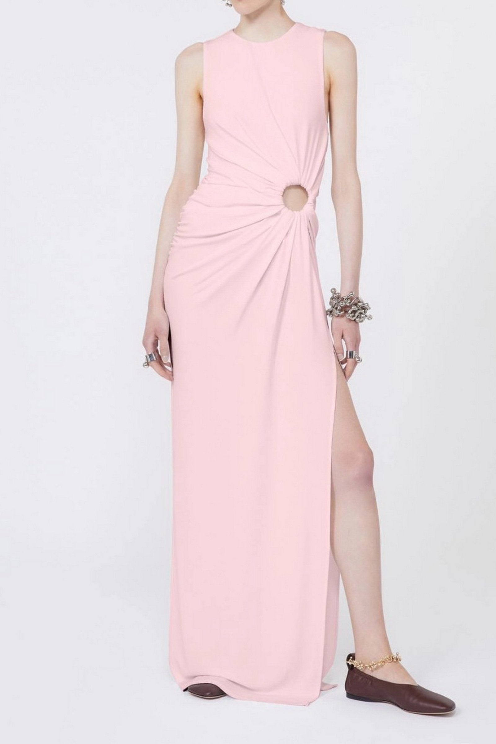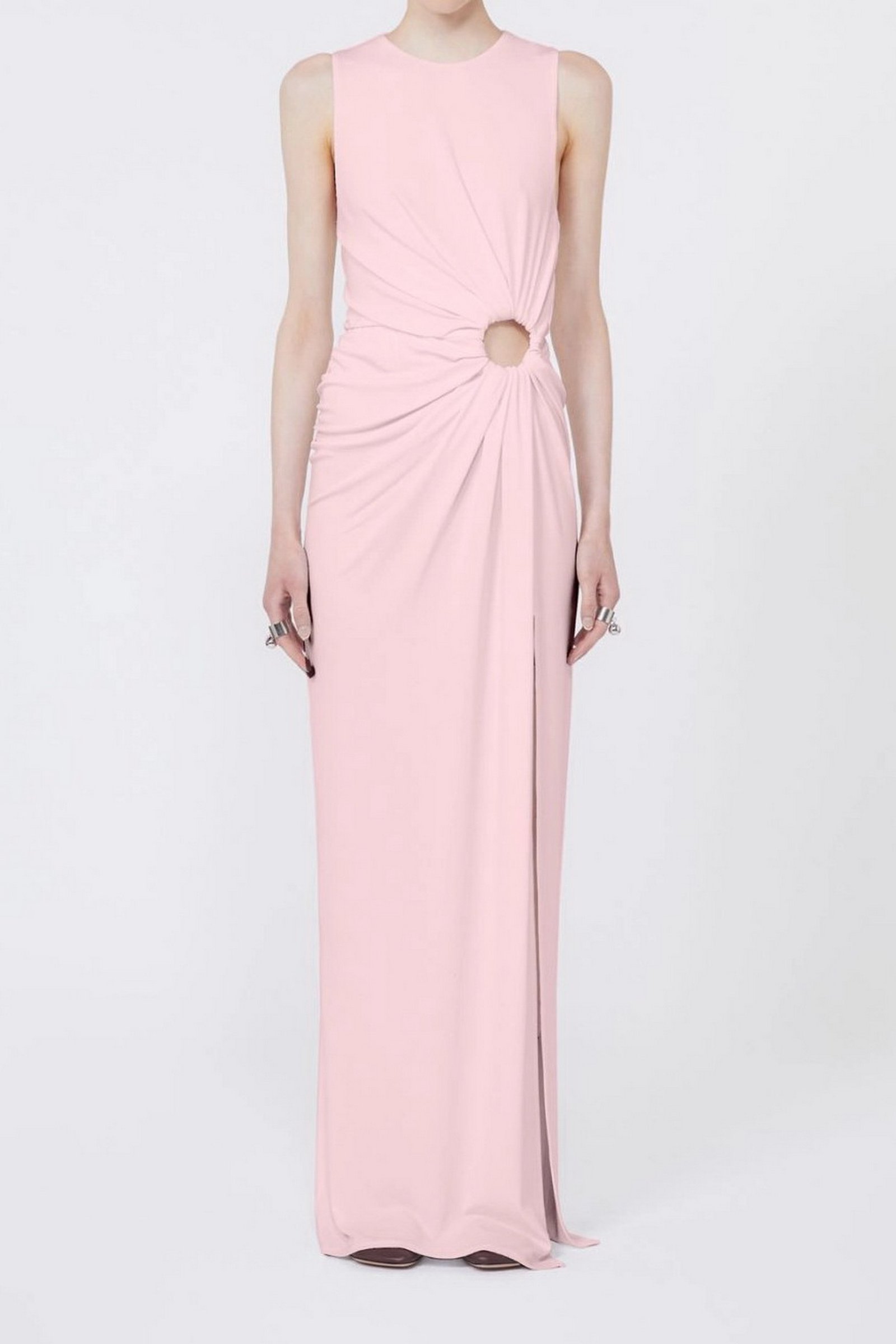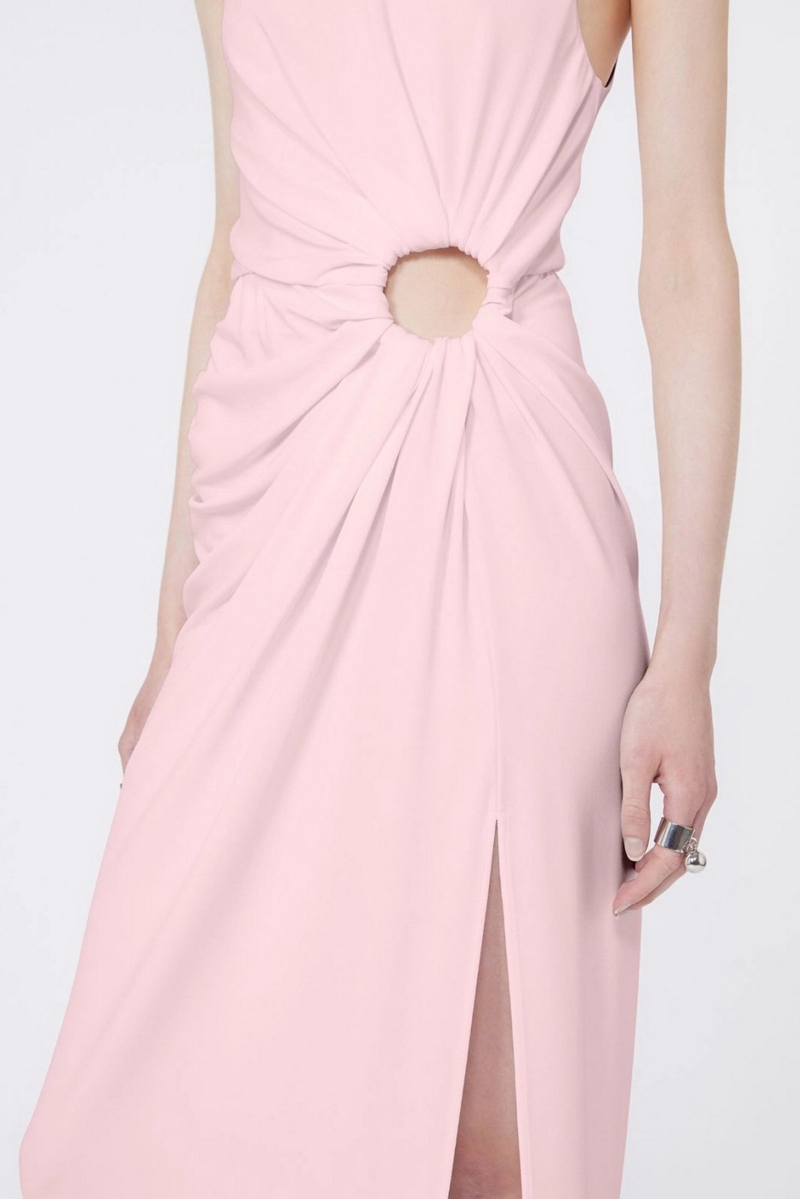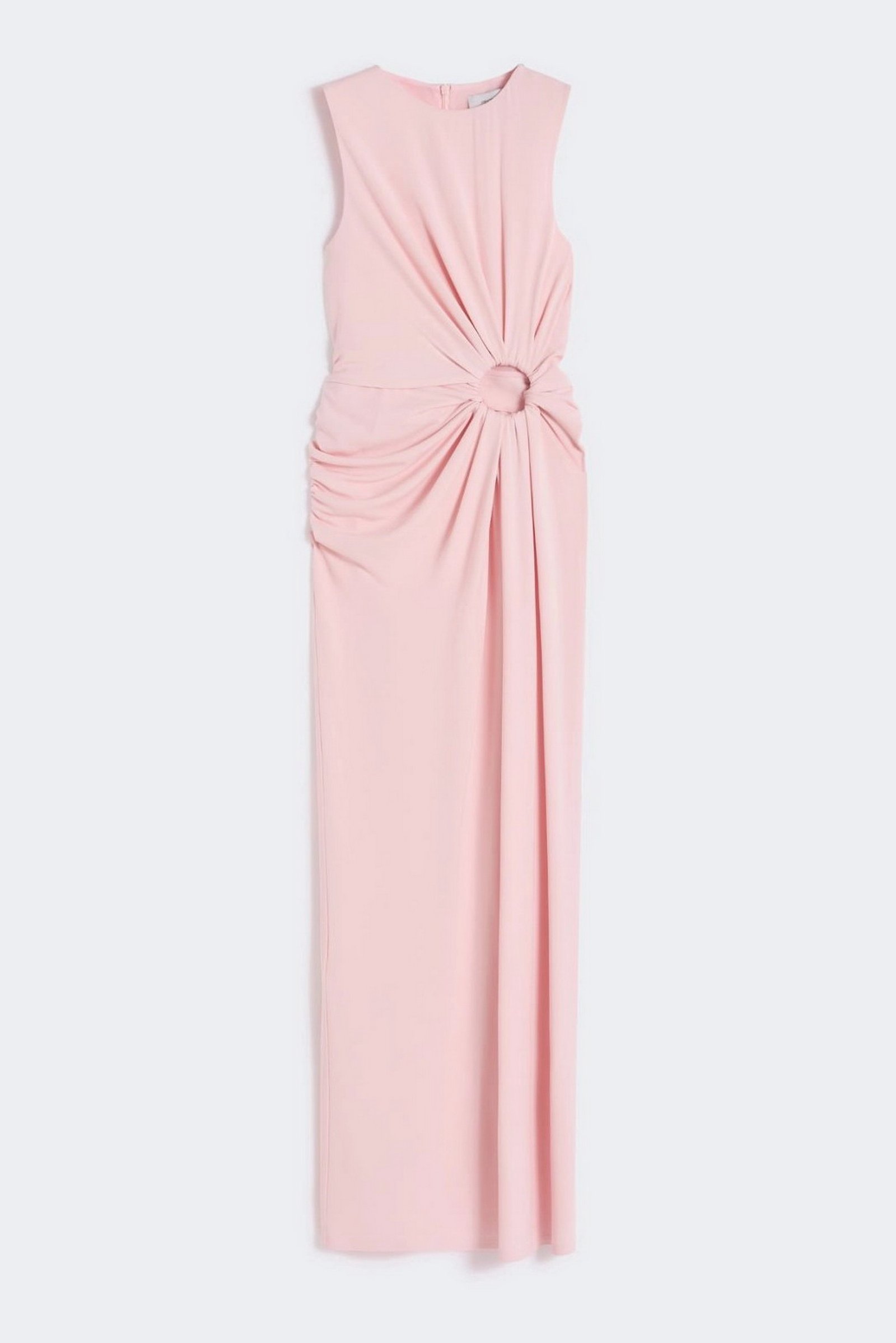 Abito aderente in jersey crêpe, con linea smanicata e scollo stondato. L’anello metallico posizionato sul fianco sinistro crea un motivo di drappeggio su tutto il capo e un oblò aperto. Motivo di arricci lungo il fianco destro.