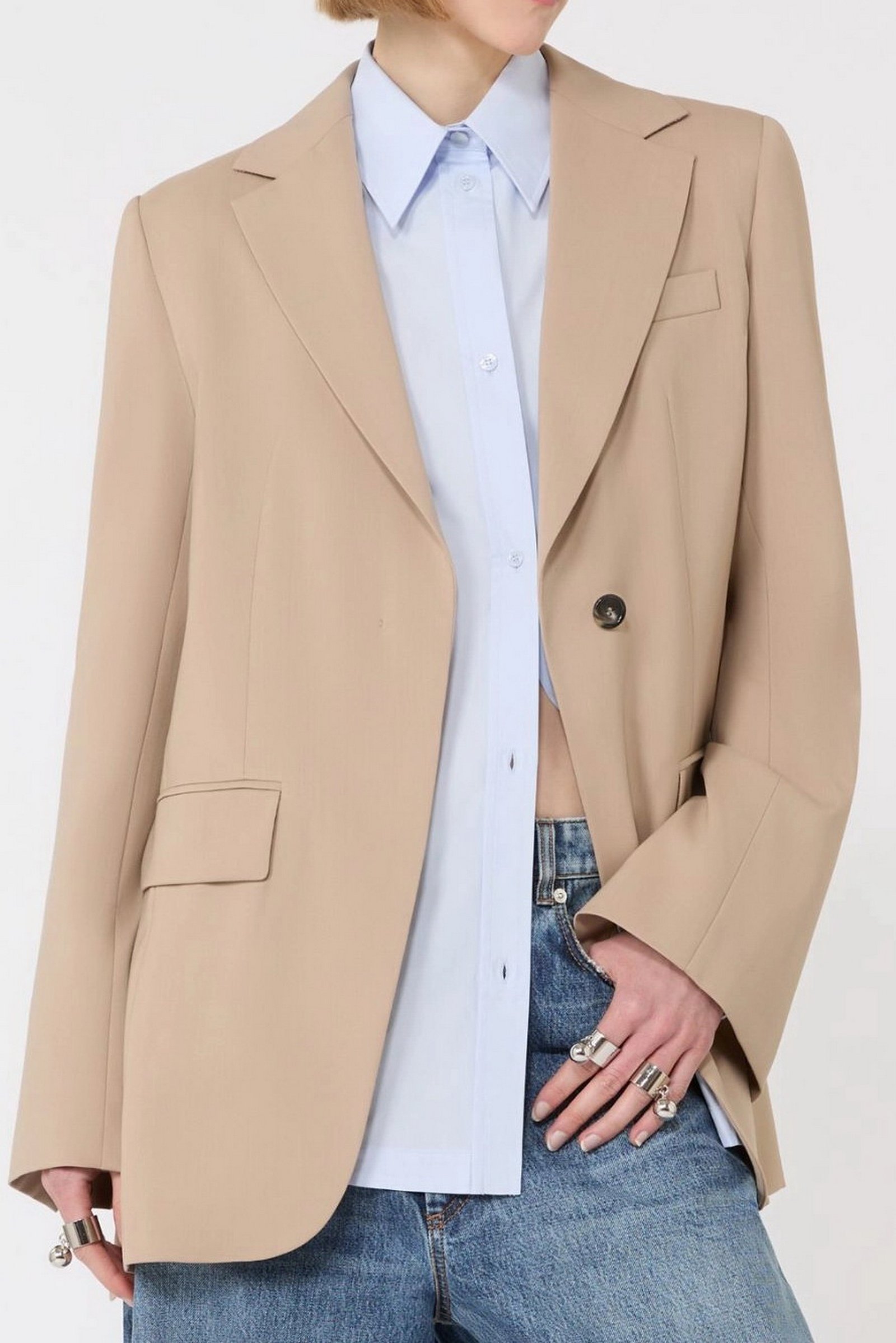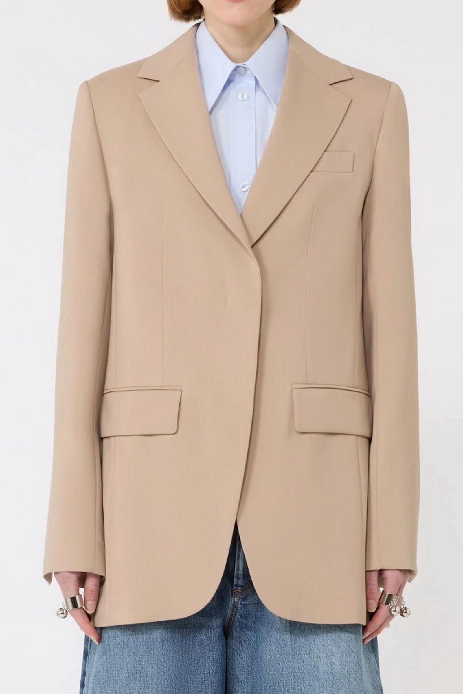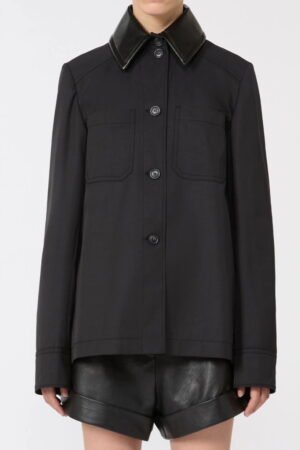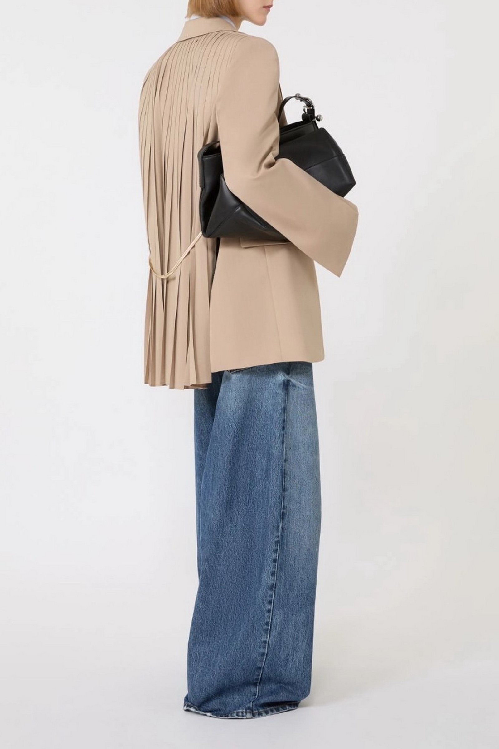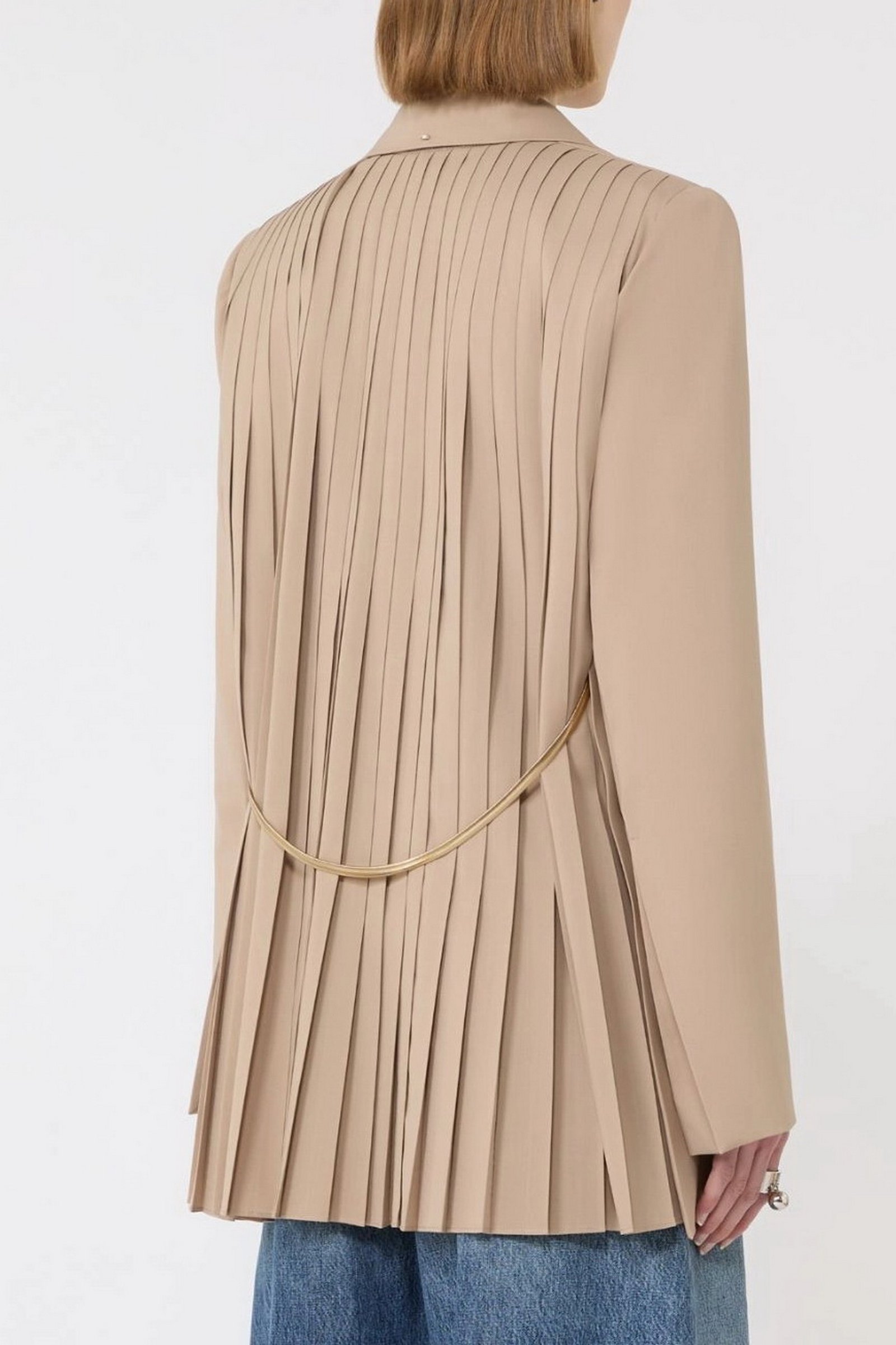 Blazer dalla costruzione sartoriale, con abbottonatura nascosta e linea leggermente sfuggente al fondo. Il retro plissettato è completato dalla cintura in catena metallica, rimovibile per un styling personalizzato.