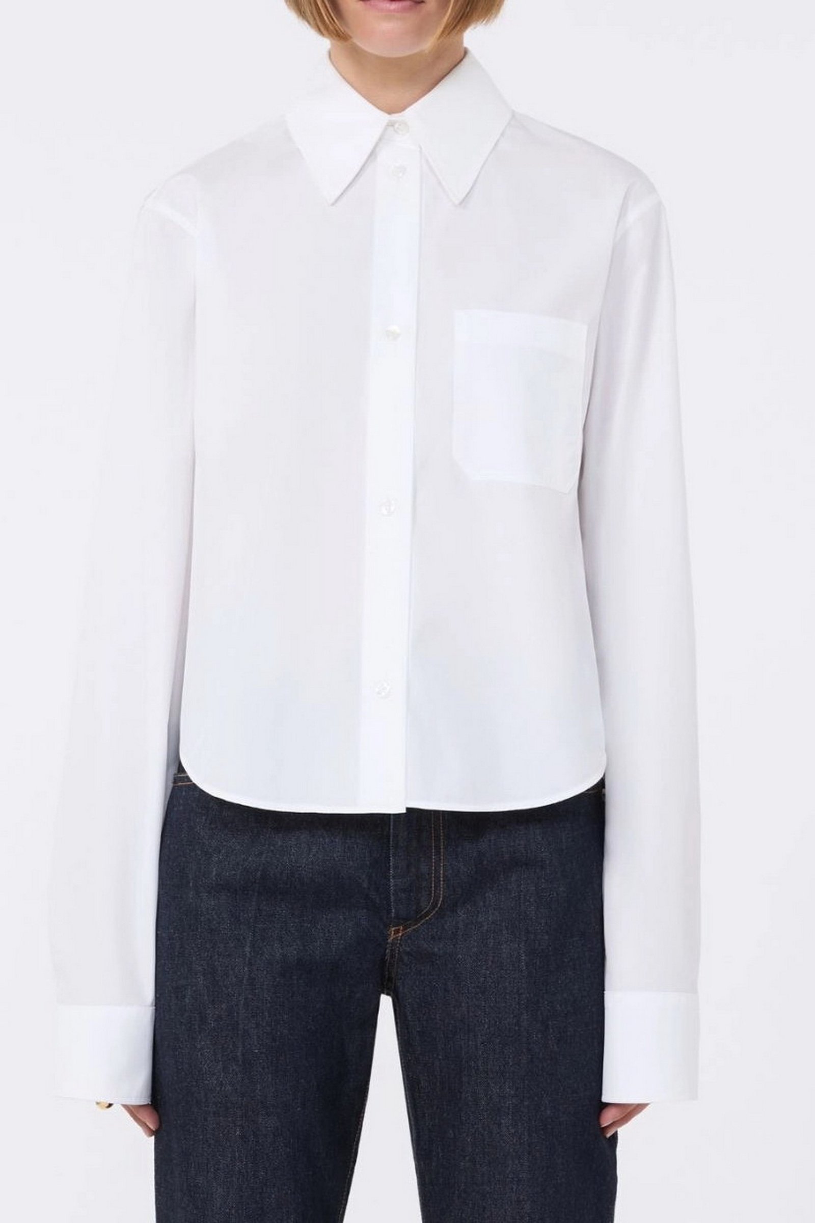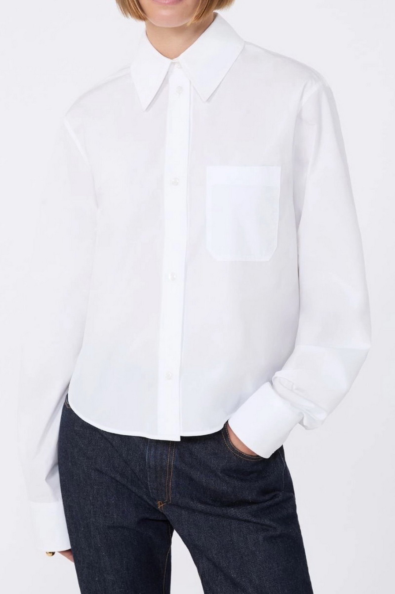 Camicia cropped realizzata in cotone tecnico. Dritta sul busto, presenta sul davanti un abbottonatura a vista e il taschino applicato. Il retro è caratterizzato da una plissettatura all over.