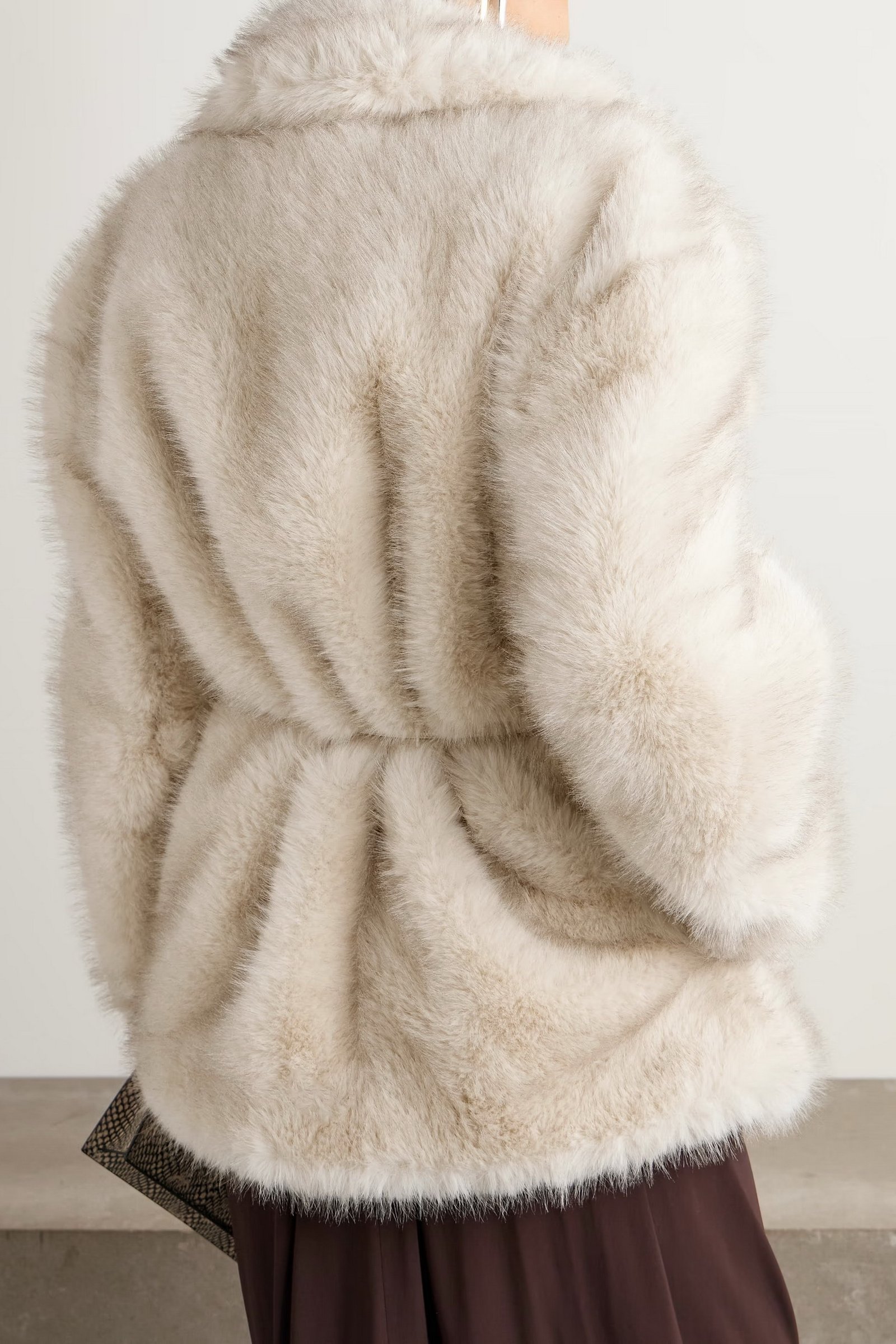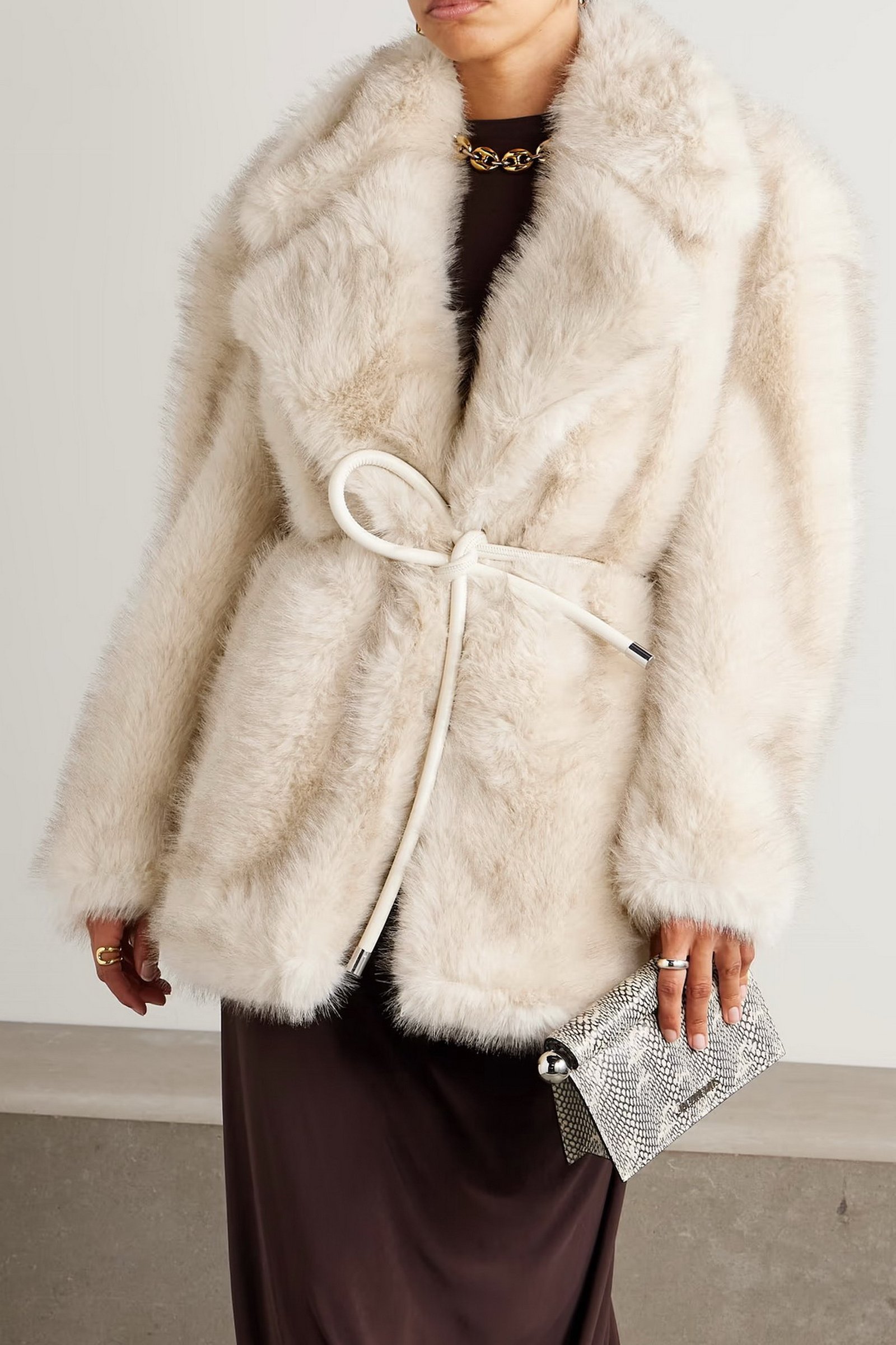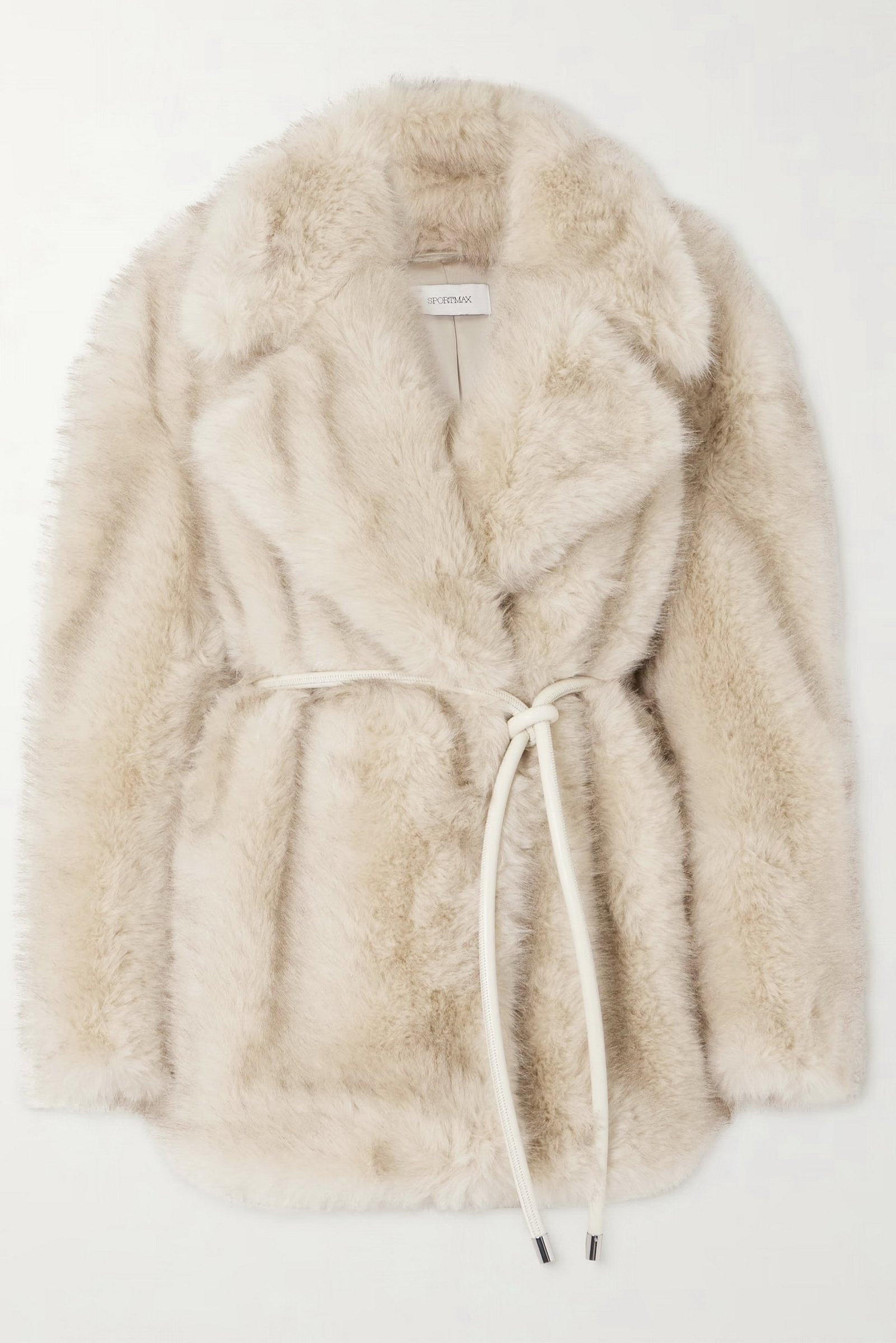 Giaccone morbido in tessuto dall’effetto furry, con rever ampio e cintura coordinata per stringere il punto vita.