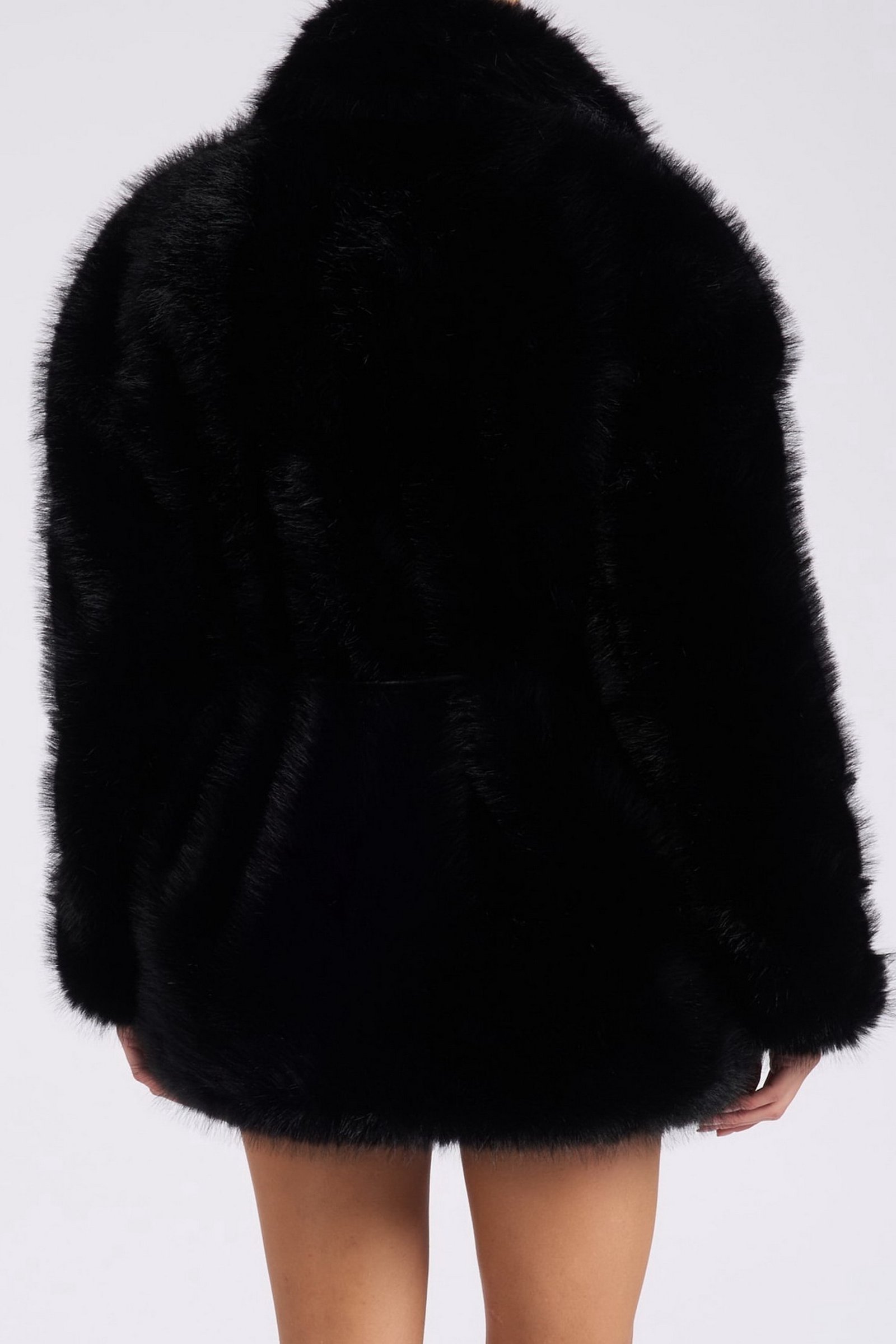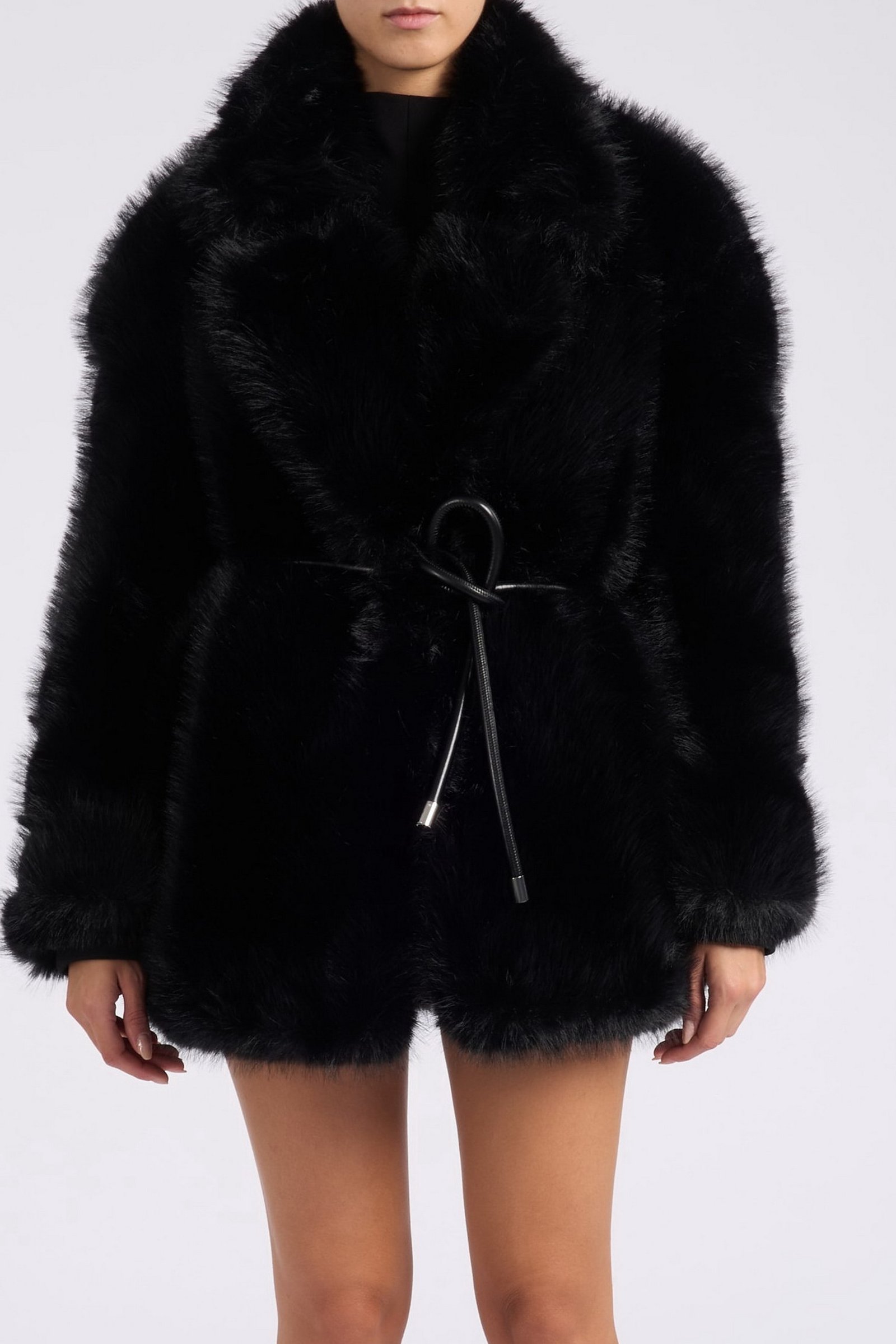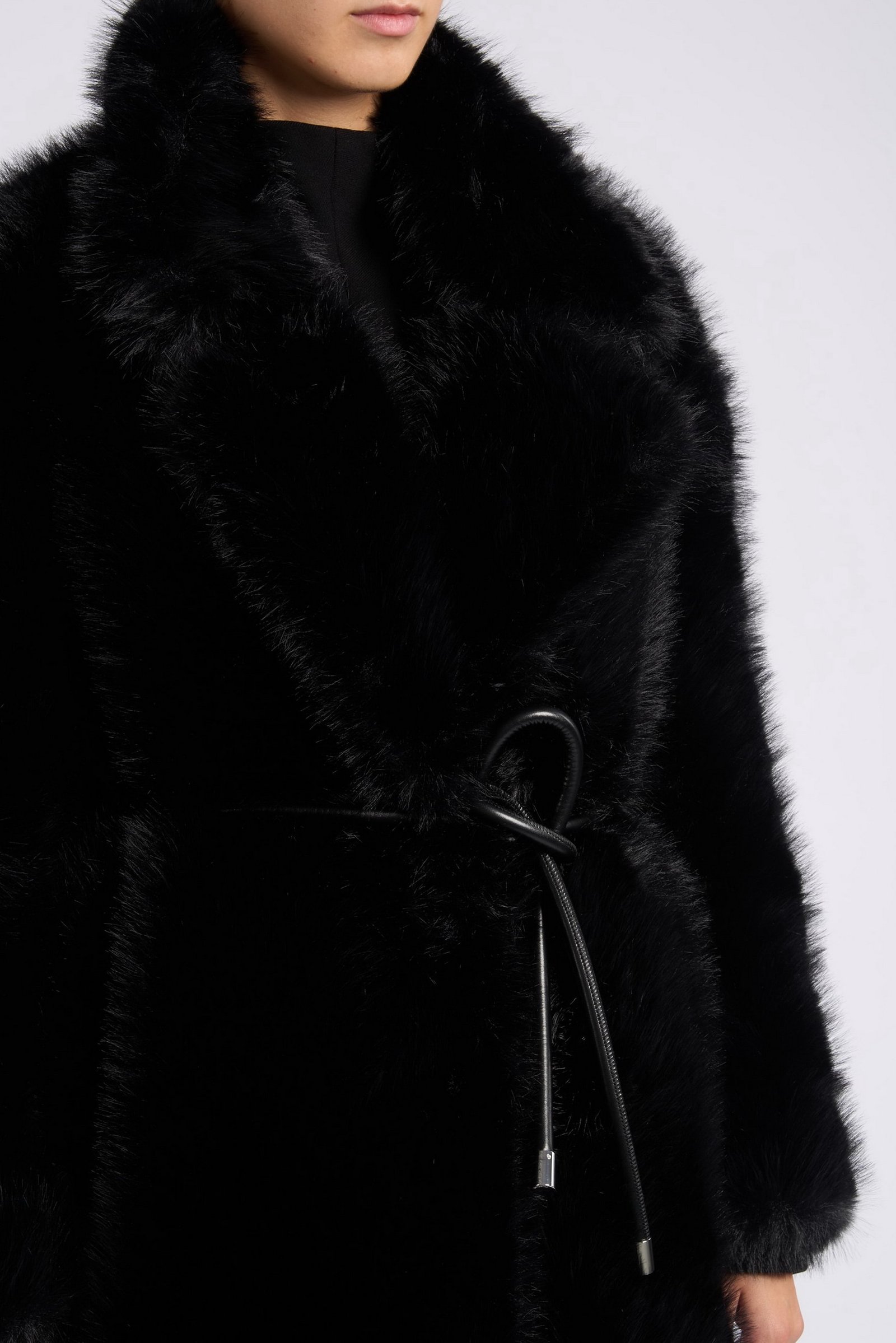 Giaccone morbido in tessuto dall’effetto furry, con rever ampio e cintura coordinata per stringere il punto vita.