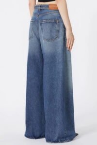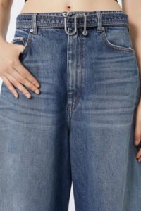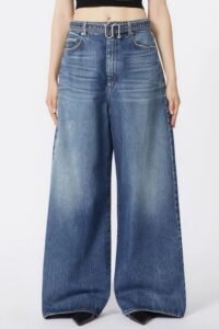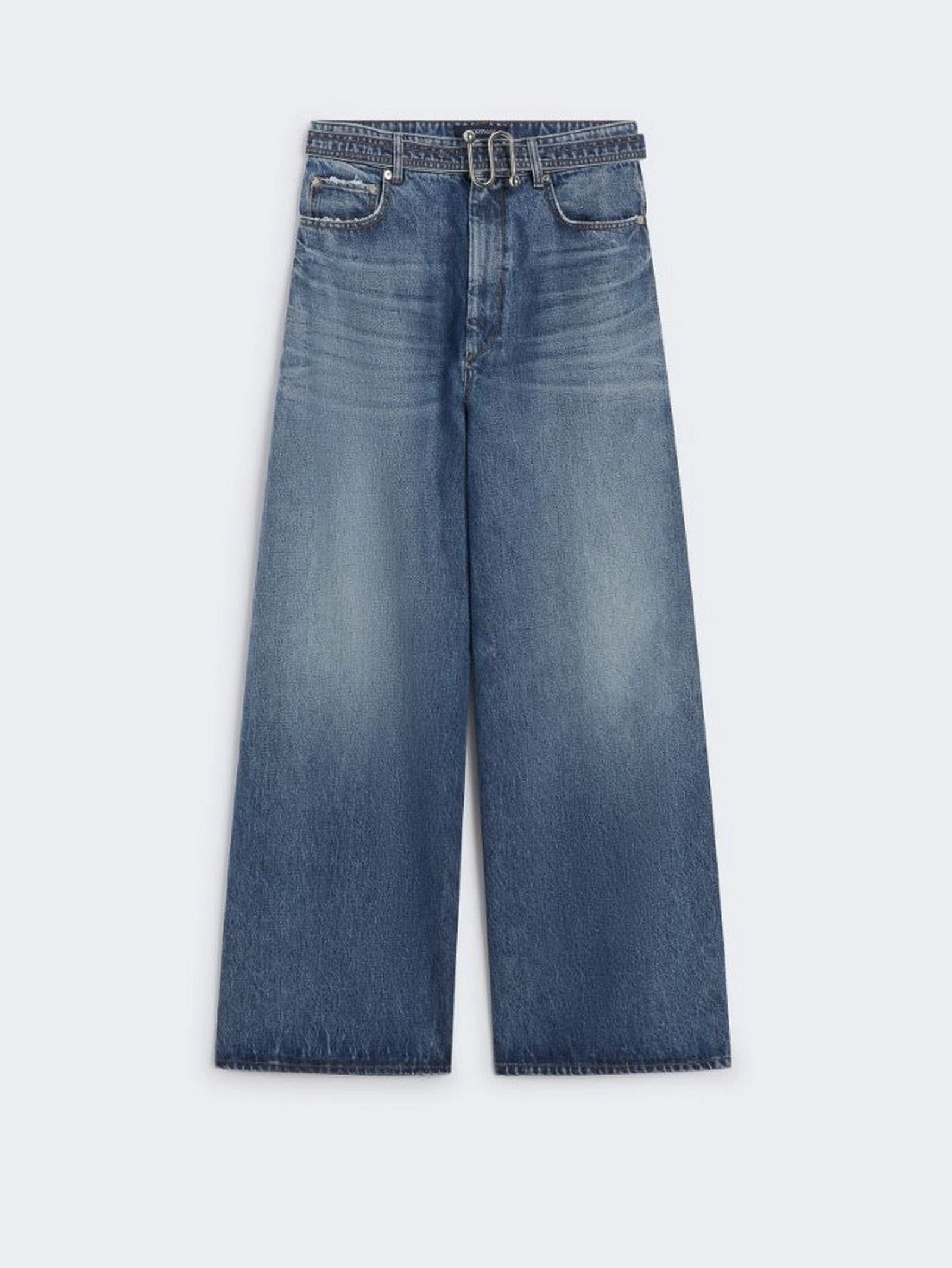 Jeans oversize a vita bassa, realizzati in denim fermo. Il volume morbido sulla gamba e la vita bassa definiscono una nuova proporzione femminile, con cintura abbinata e fibbia a S per una nota personalizzata.