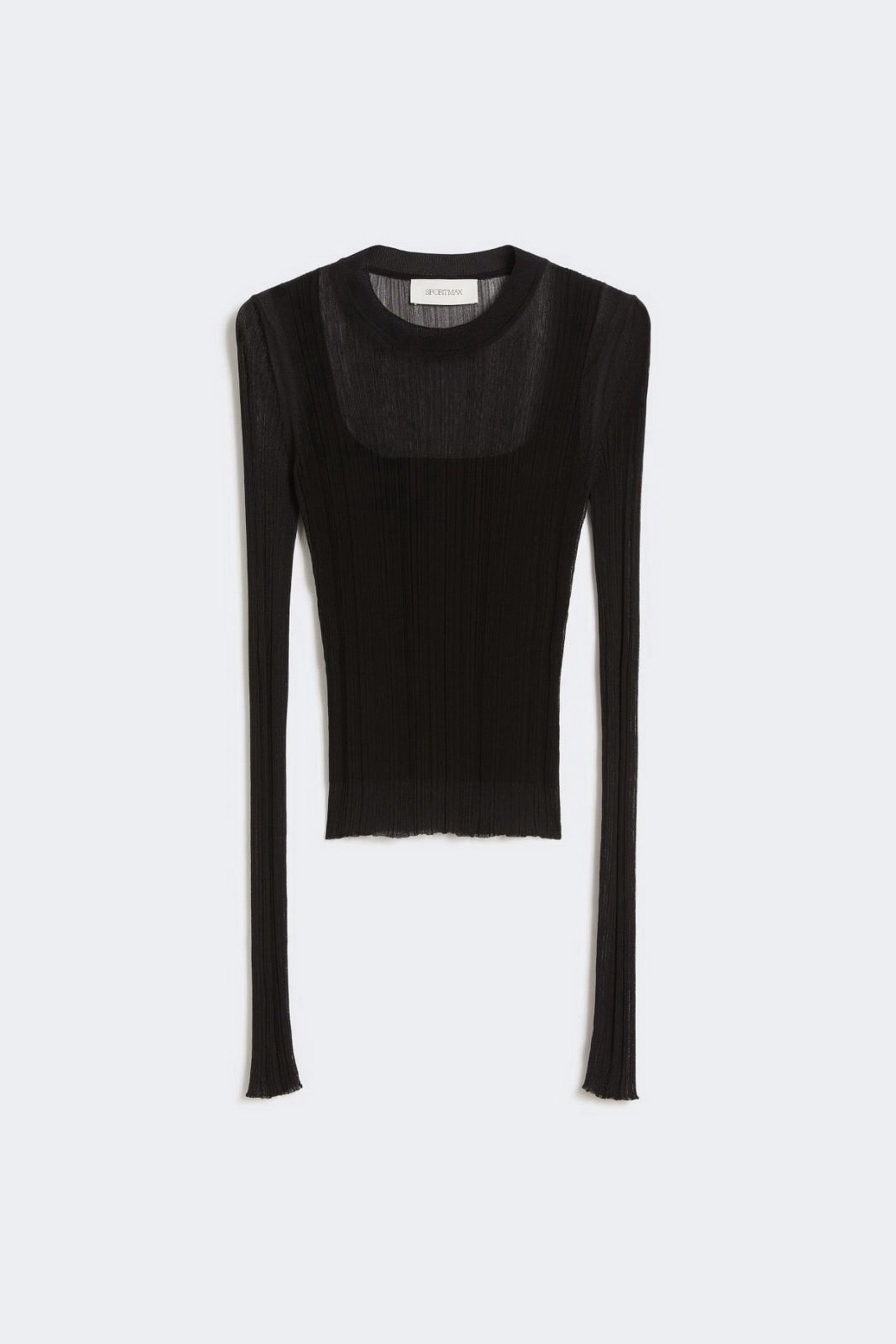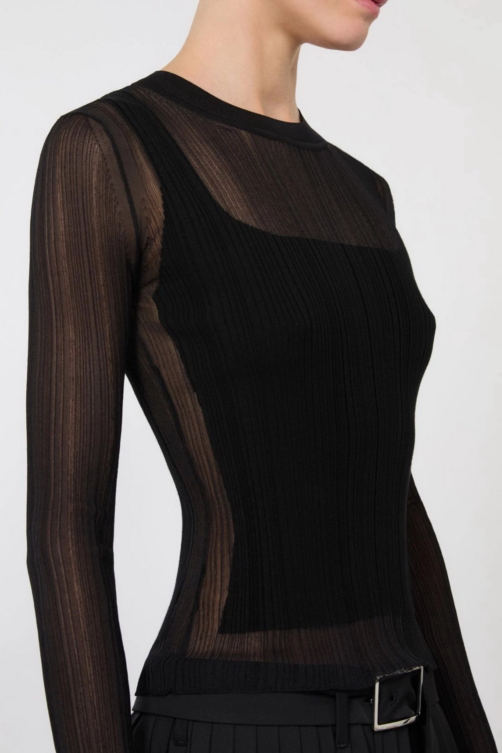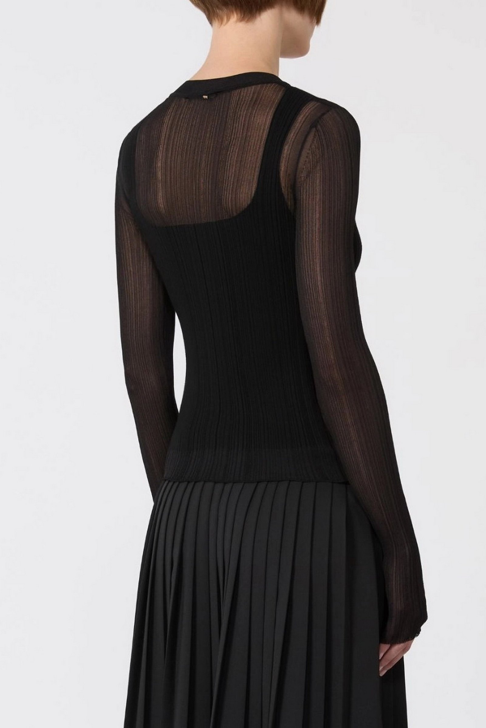 Maglia girocollo realizzata in misto viscosa stretch, con una speciale lavorazione a costine semi trasparente dall’effetto trompe l’oeil. Aderente, diventa coprente sul busto creando una silhouette a canotta. – Maglia in misto viscosa stretch – Lavorazione a coste – Effetto trompe l’oeil coprente dalla linea a canotta – Vestibilità regolare