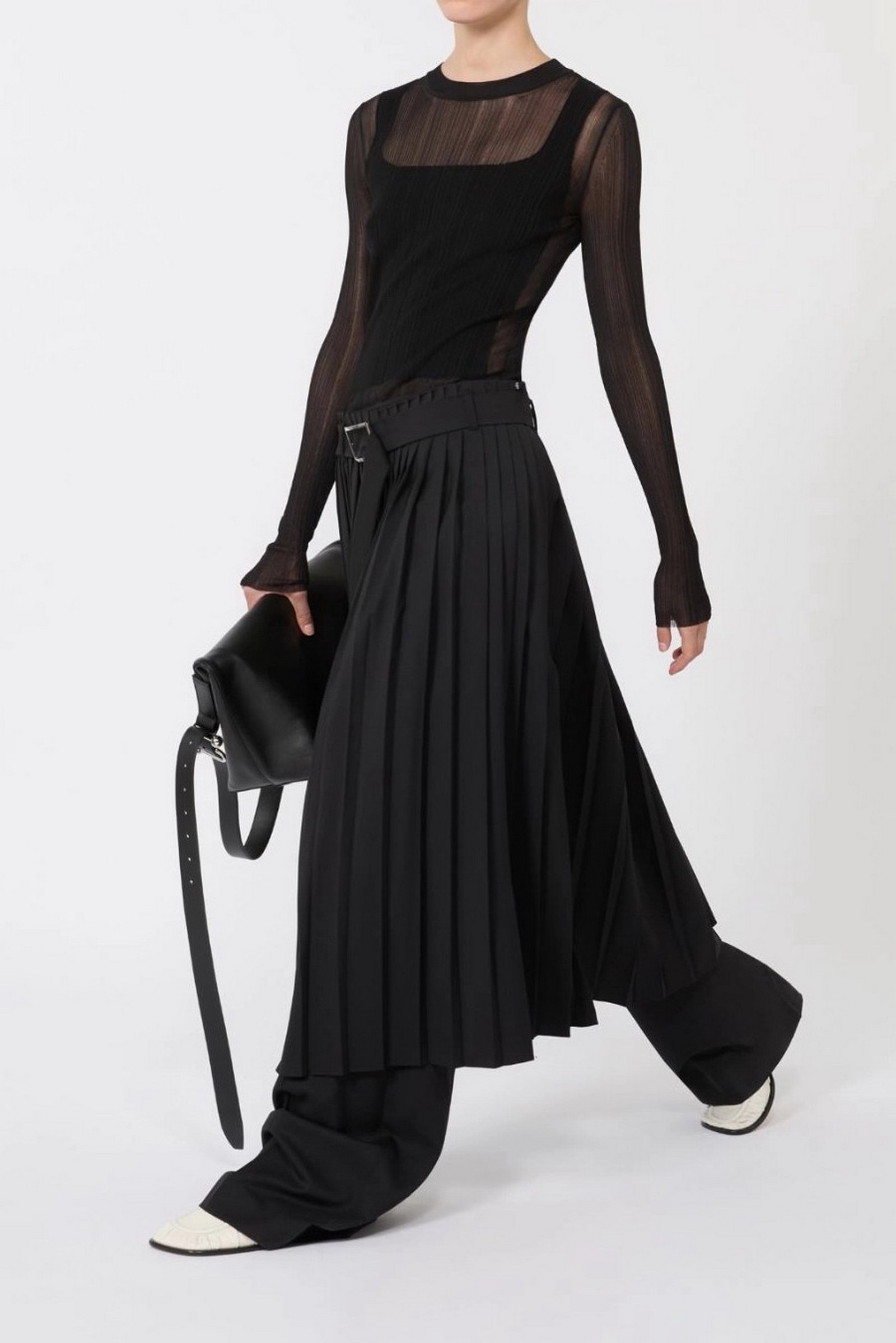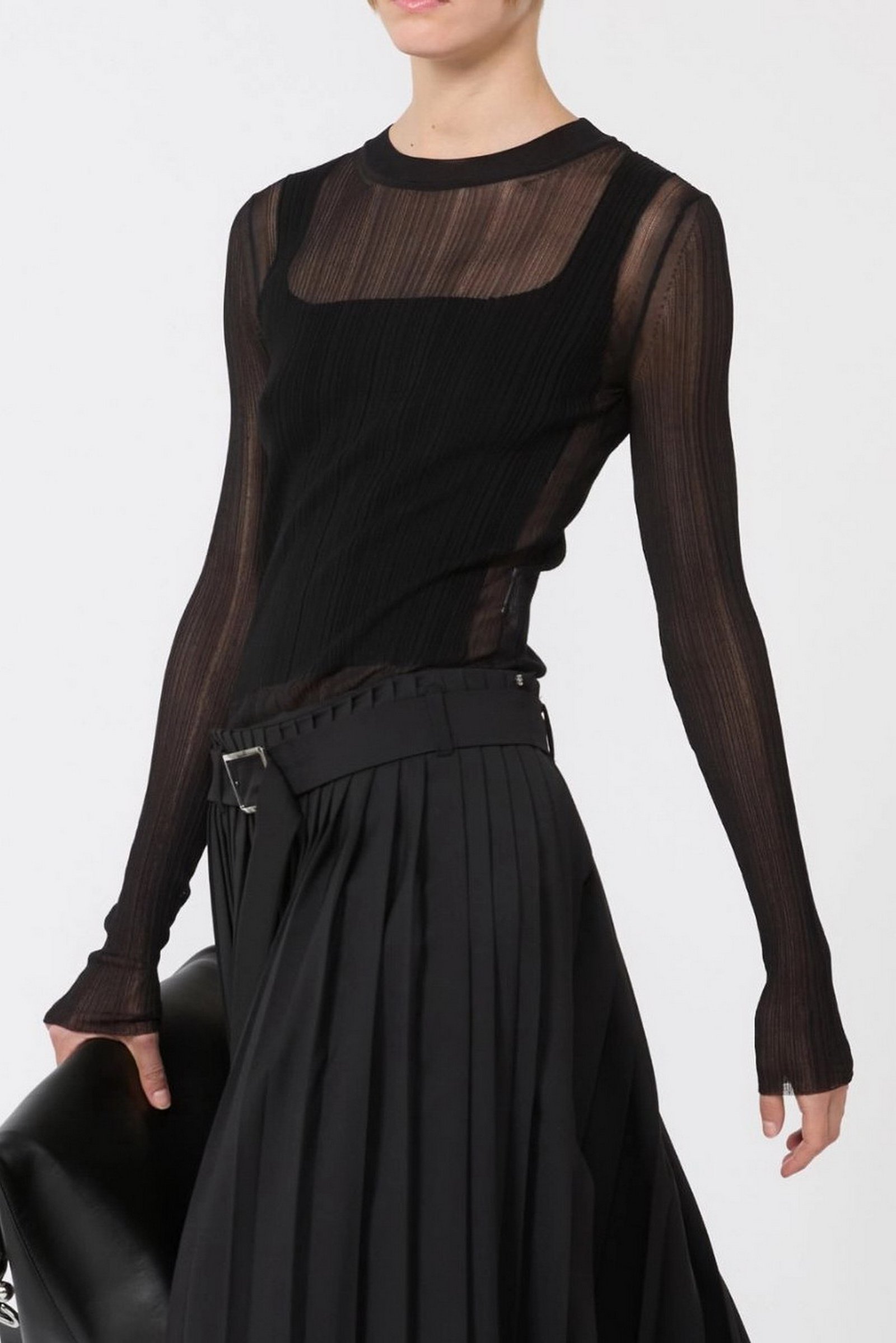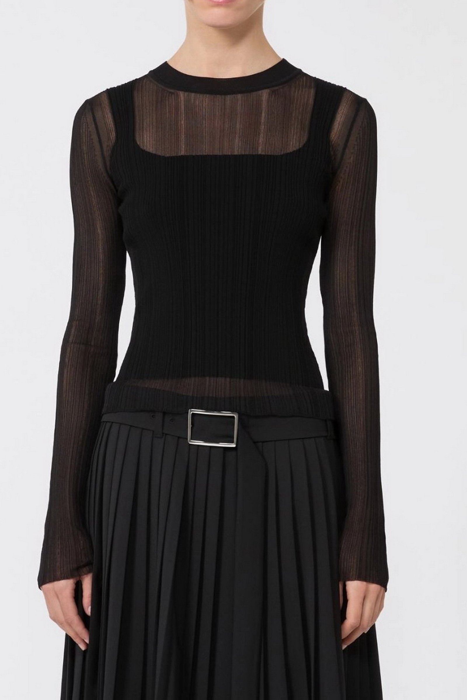 Maglia girocollo realizzata in misto viscosa stretch, con una speciale lavorazione a costine semi trasparente dall’effetto trompe l’oeil. Aderente, diventa coprente sul busto creando una silhouette a canotta. – Maglia in misto viscosa stretch – Lavorazione a coste – Effetto trompe l’oeil coprente dalla linea a canotta – Vestibilità regolare