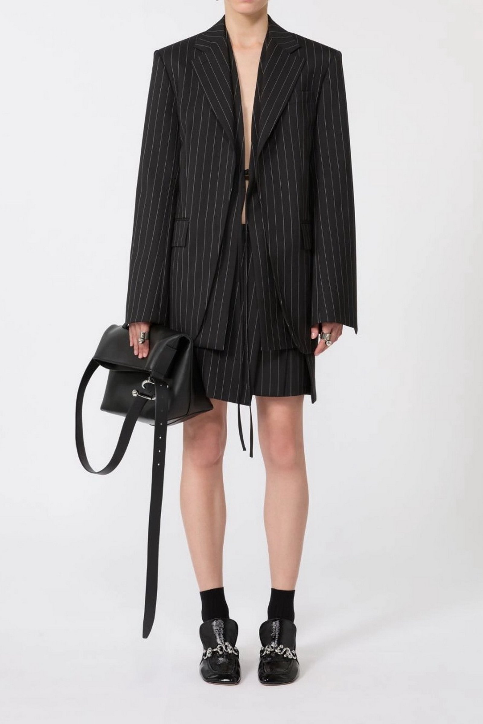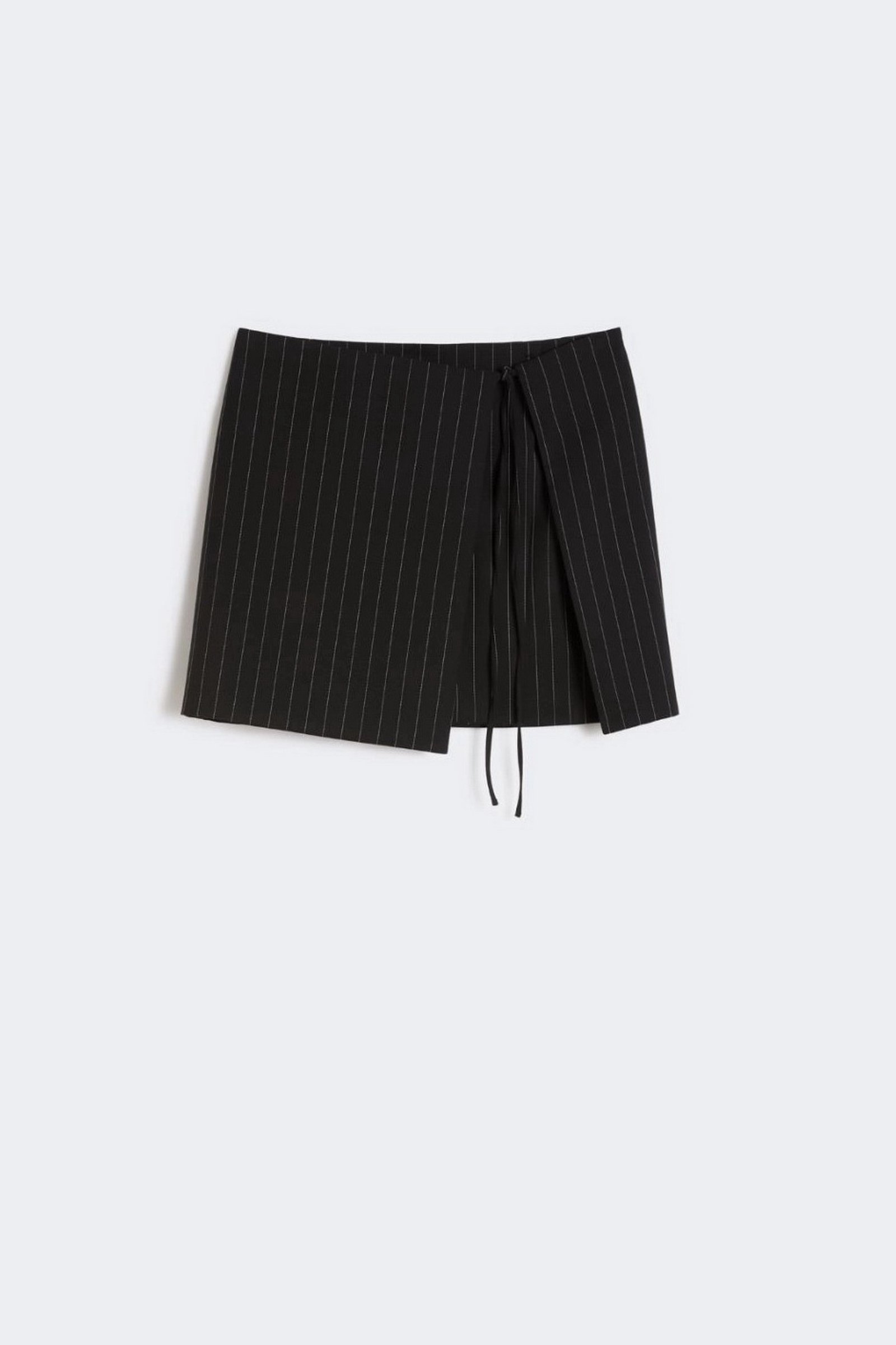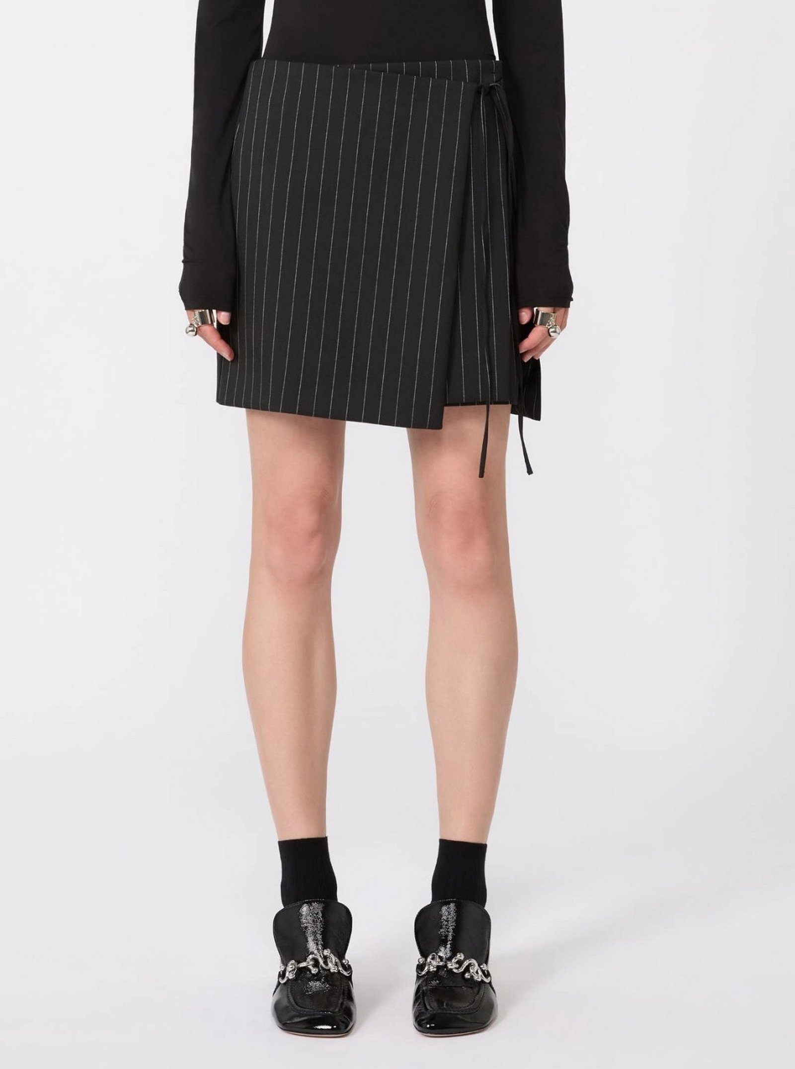Mini gonna in lana stretch, con fantasia gessata e linea a portafoglio sul davanti. Chiusa con automatici nascosti, è caratterizzata da due pannelli asimmetrici fermati da laccetti annodati.