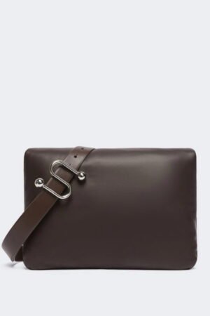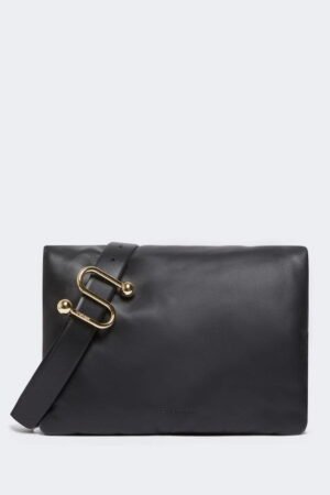 Mini envelope bag con quadranti realizzati in morbida nappa mano guanto e imbottitura interna. La patta si chiude con bottone a calamita. Manico in catena metallica con elementi a S e tracollina rimovibile in pelle per uno styling modulabile.