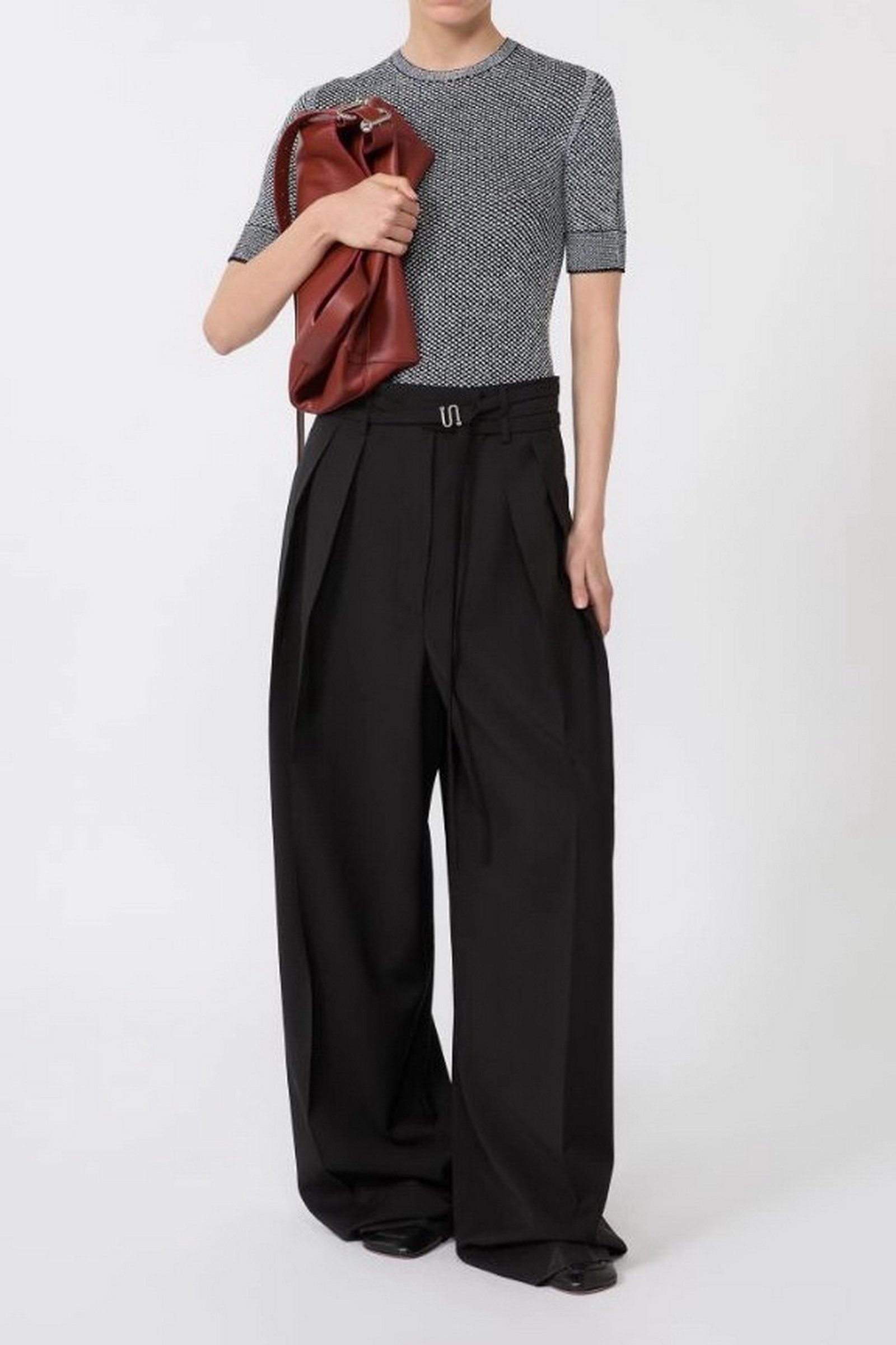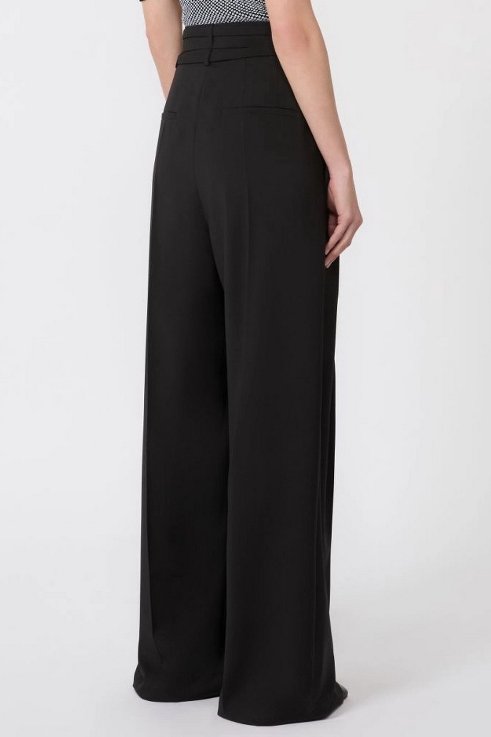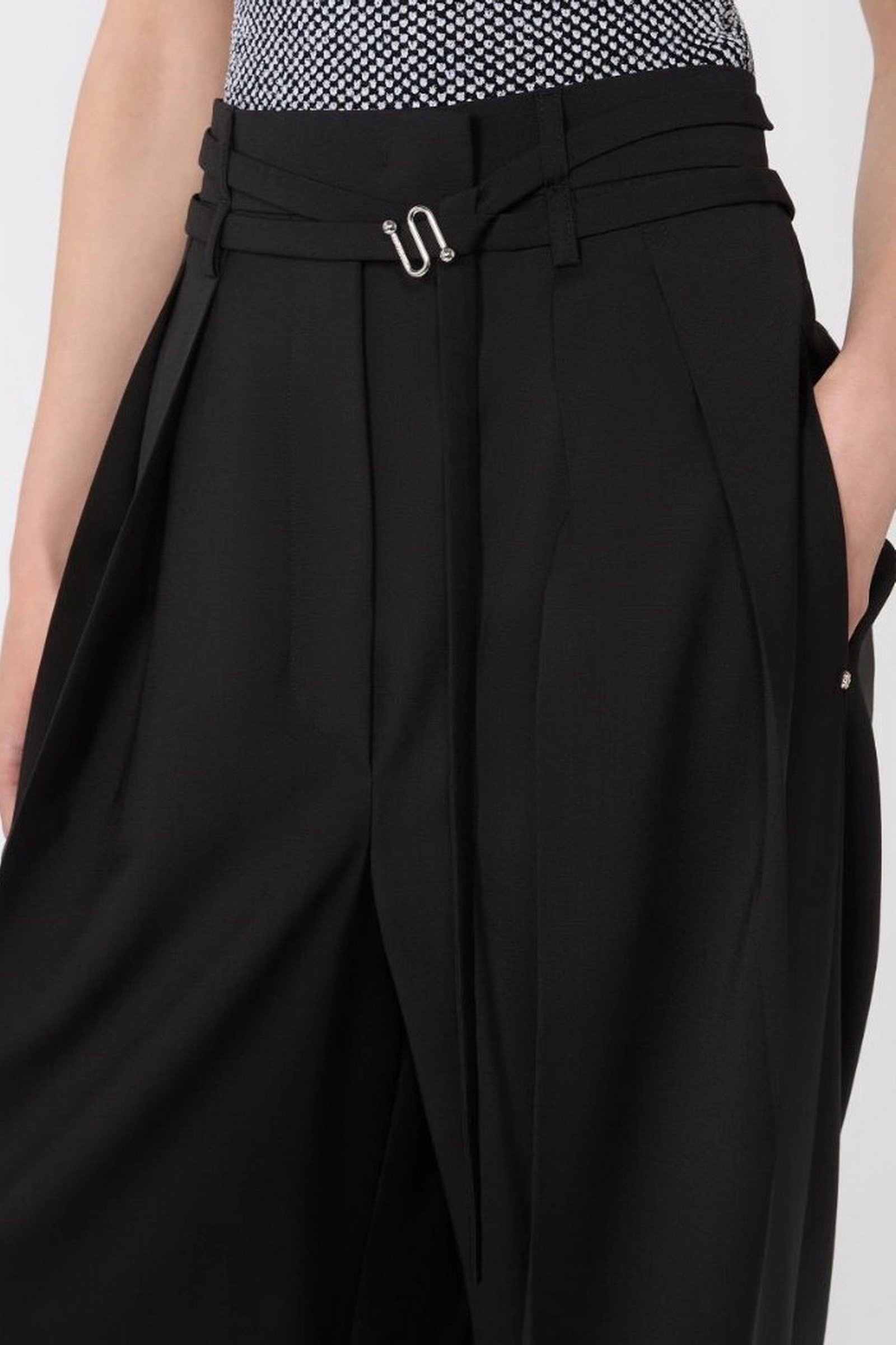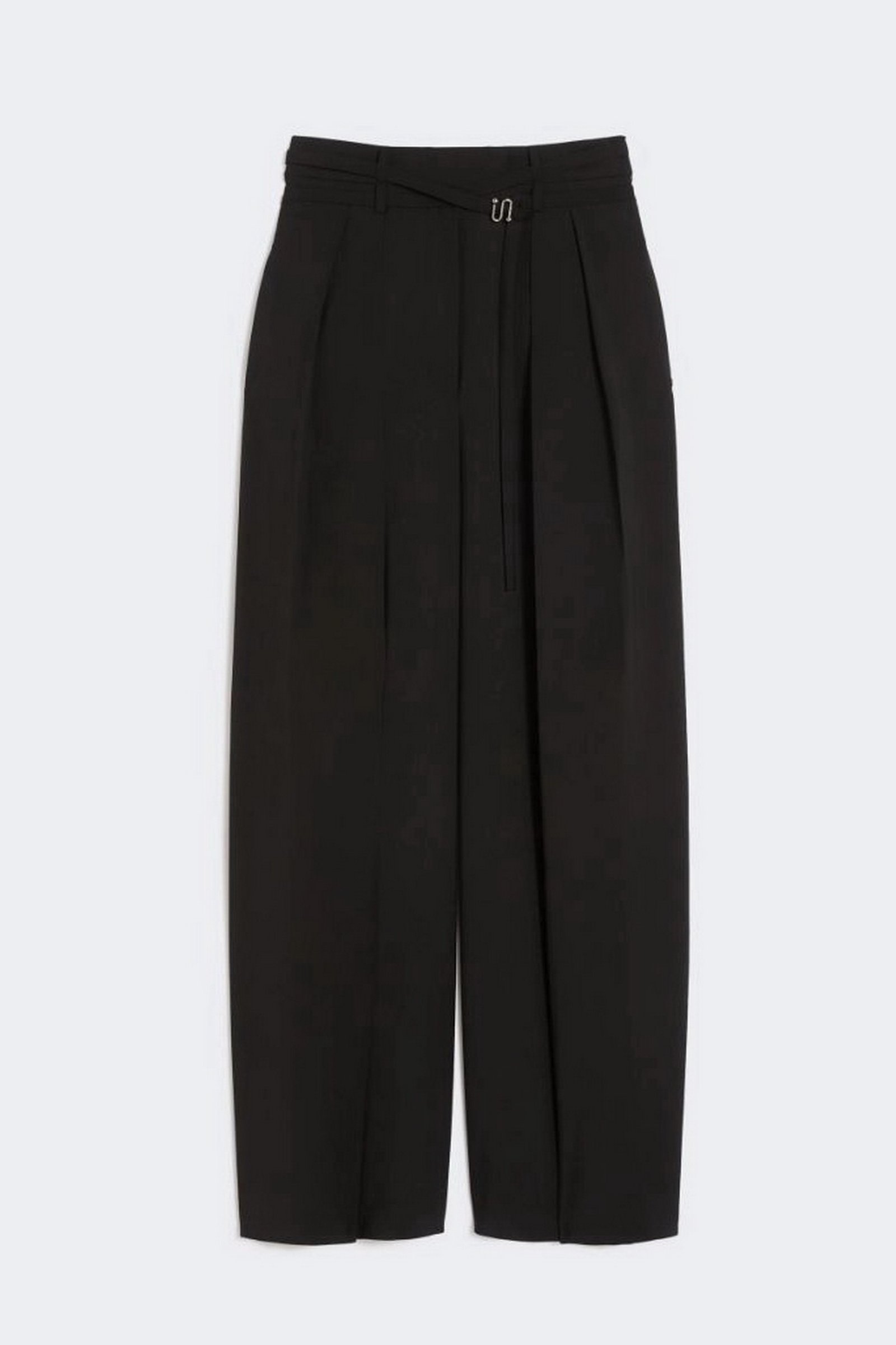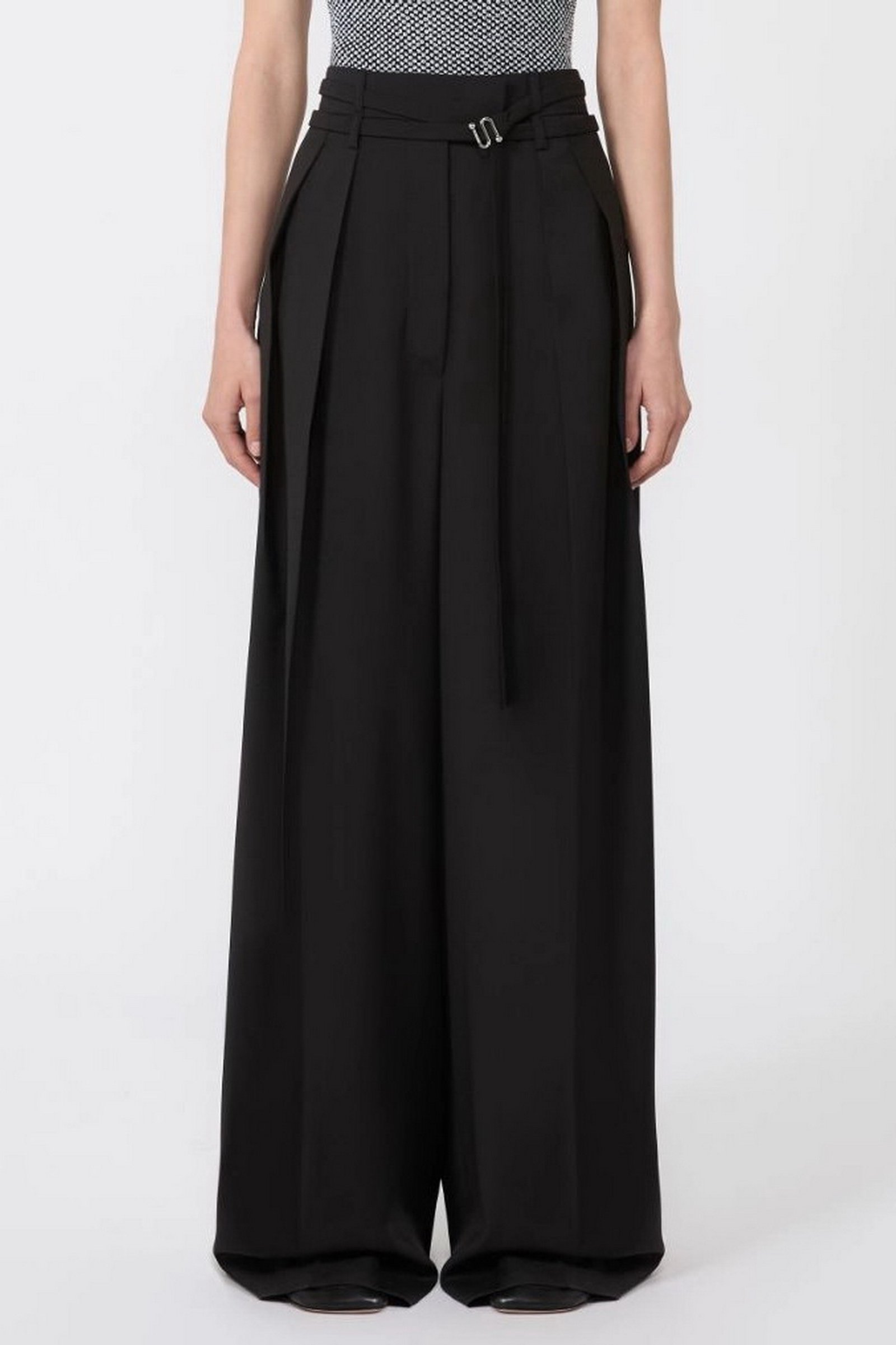 Pantalone dal volume ampio sulla gamba, con punto vita definito da pince e dalla cintura a doppio giro con fibbia metallica a S.