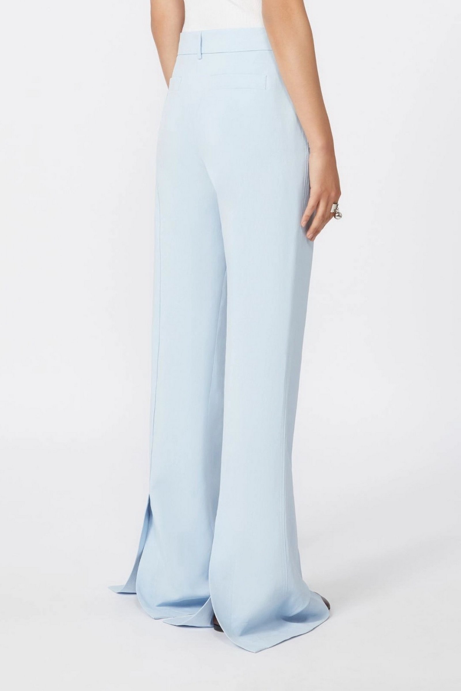 Pantalone dalla linea flare, con fit aderente e linea femminile. La costruzione si ispira ai modelli sartoriali , con allacciatura coperta e piega stirata. Piccolo spacco sovrapposto sul retro per una linea ancora più svasata sul piede.