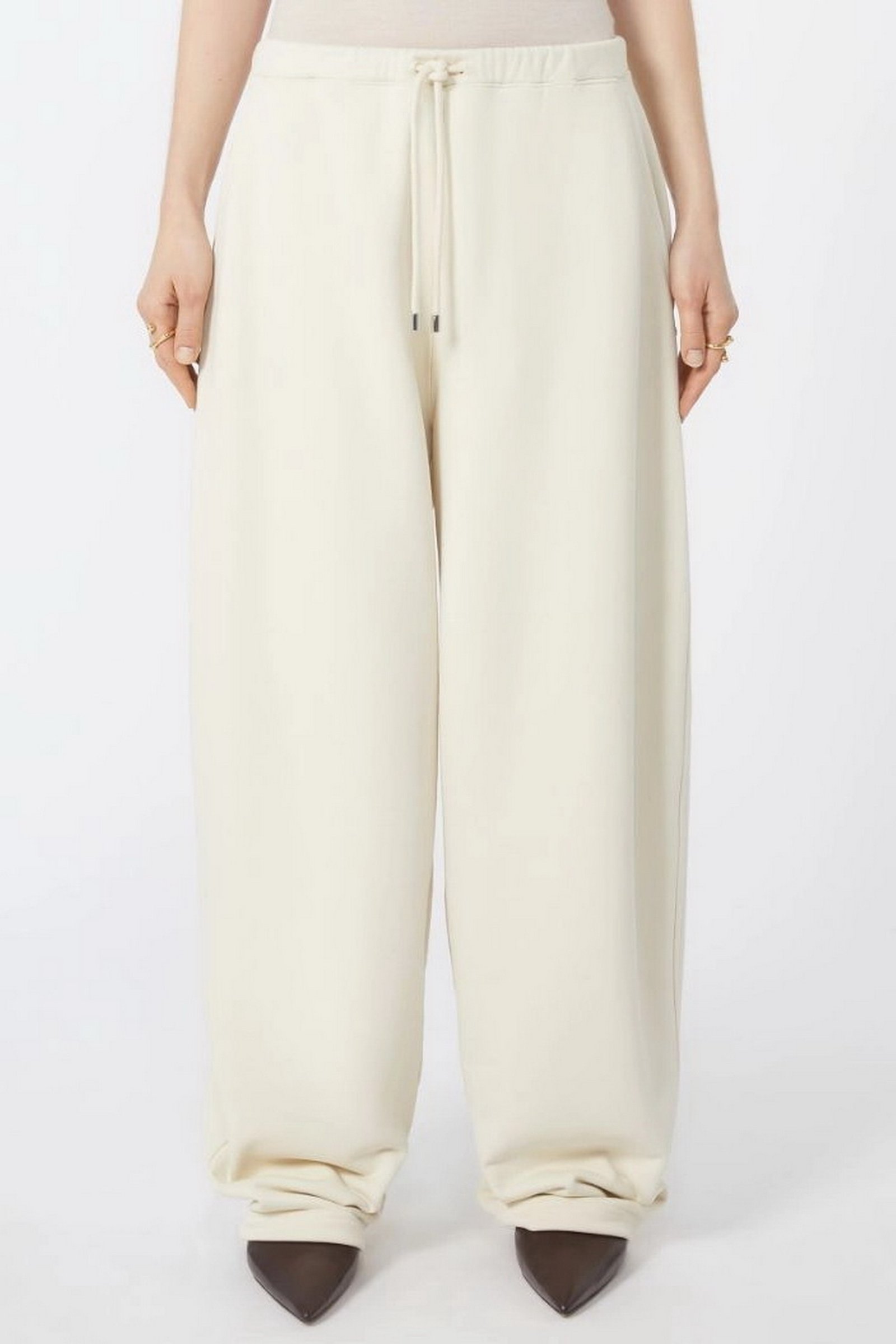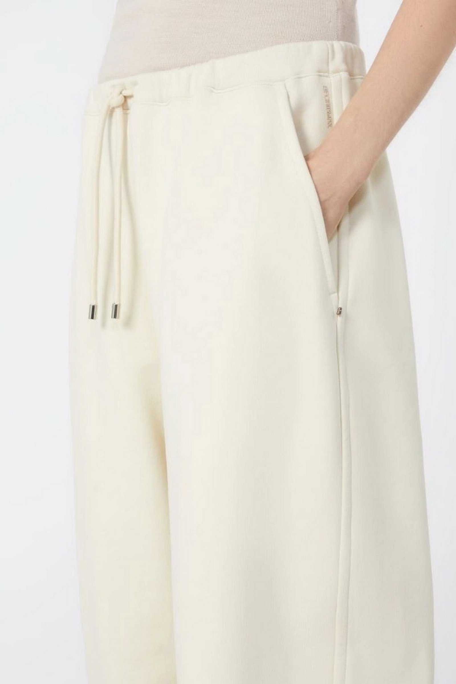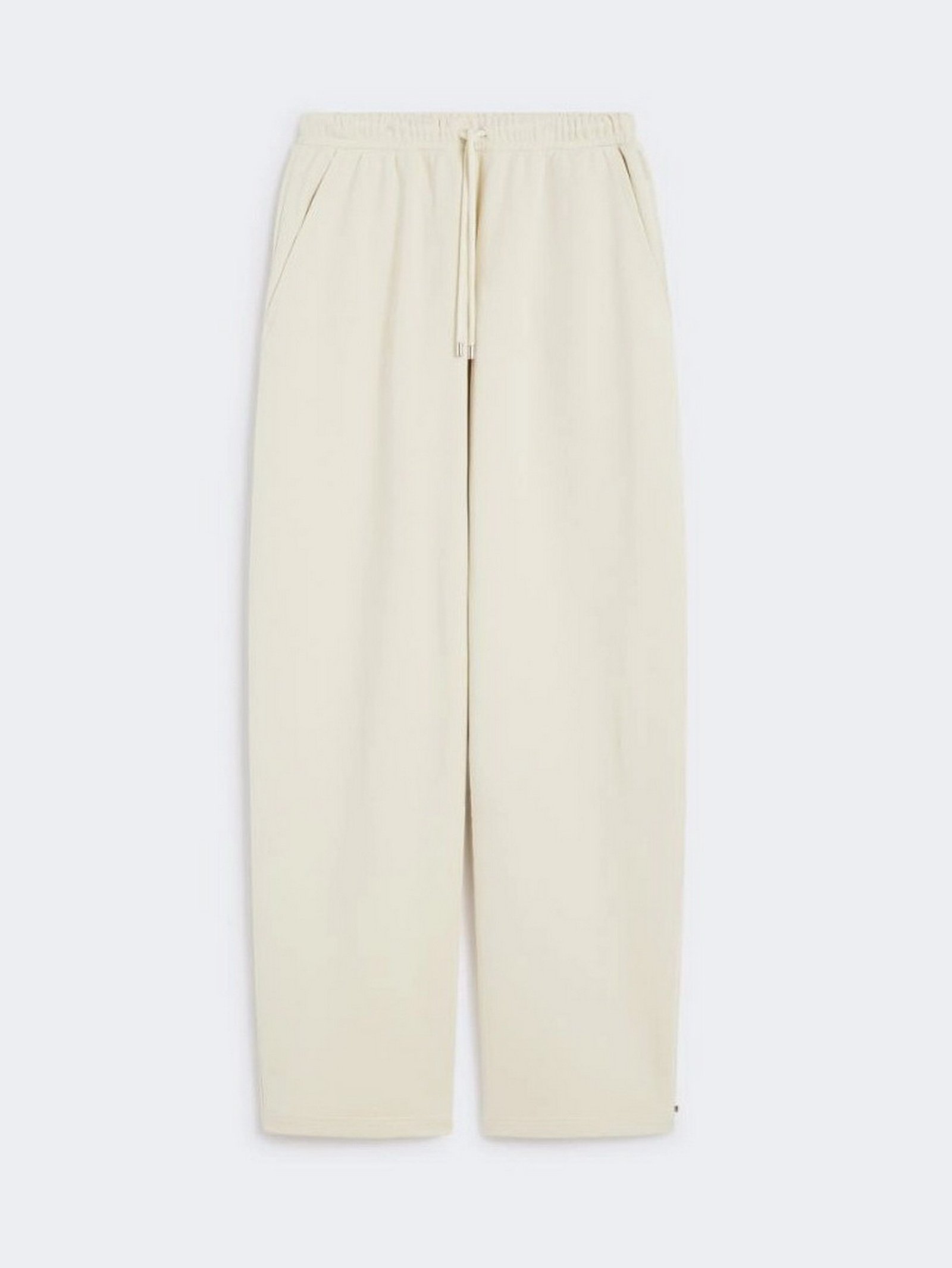 Pantalone morbido in felpa leggera, con coulisse e tasche laterali per una perfetta funzionalità. La linea fluida sulla gamba assicura comfort in ogni occasione.
