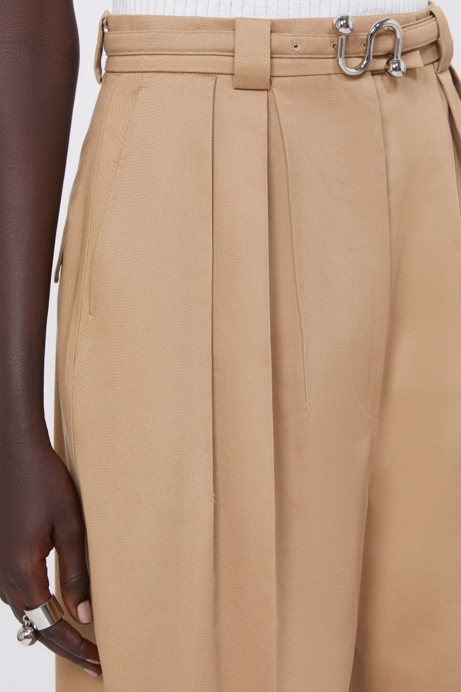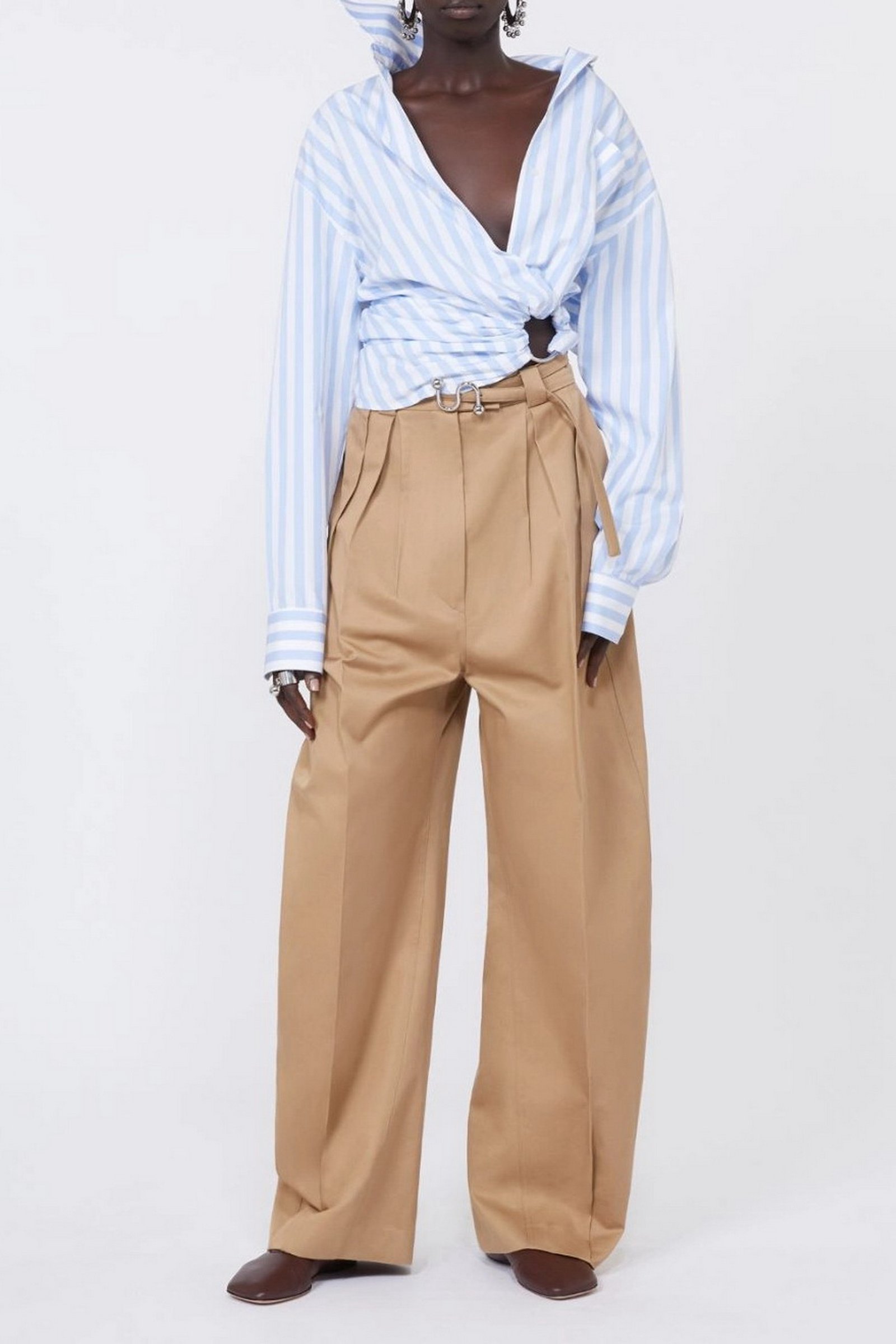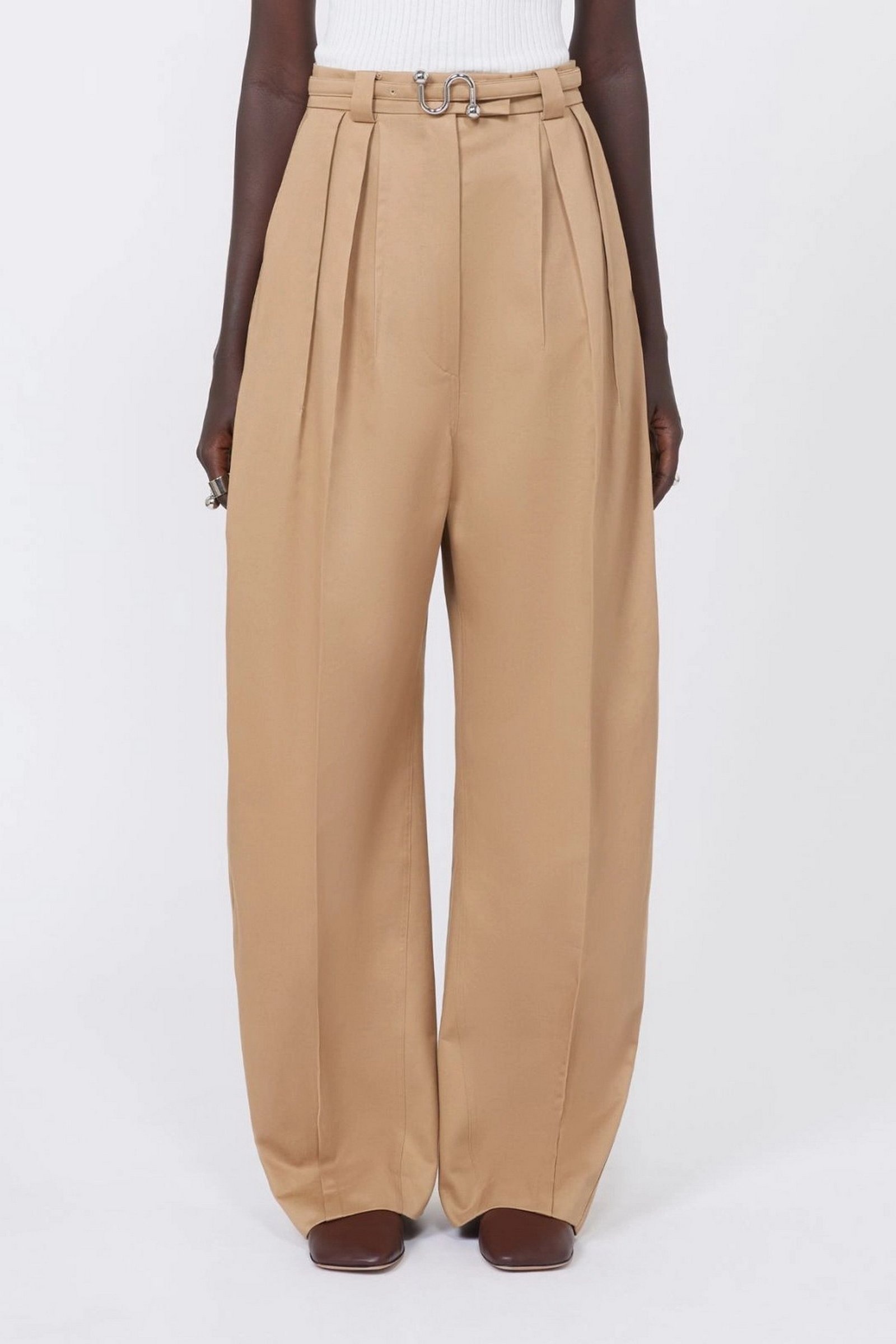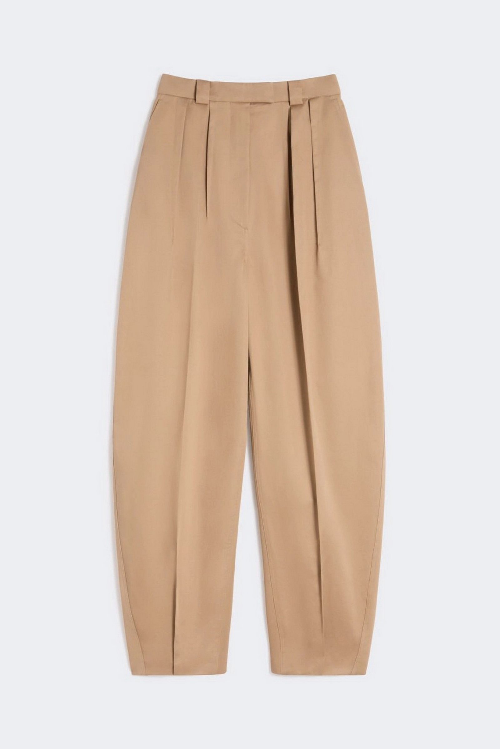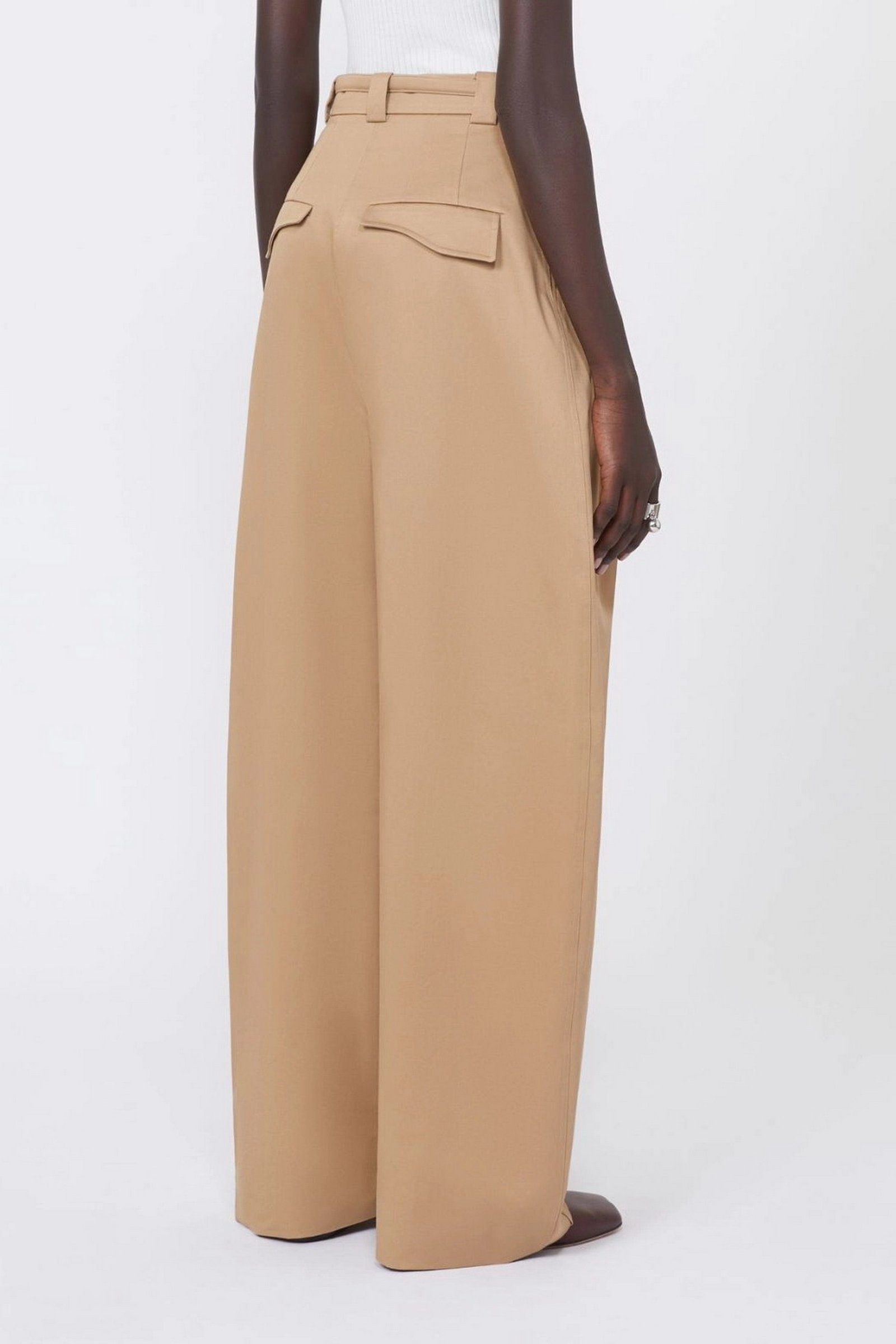 Pantalone in gabardina di cotone, con punto vita aderente definito da cintura e doppie pince, mentre la gamba si allarga in volume oversize chiuso al fondo da cuciture sagomate e pince alla caviglia. La cintura interna precostruita e le tasche si ispirano ai modelli sartoriali maschili.