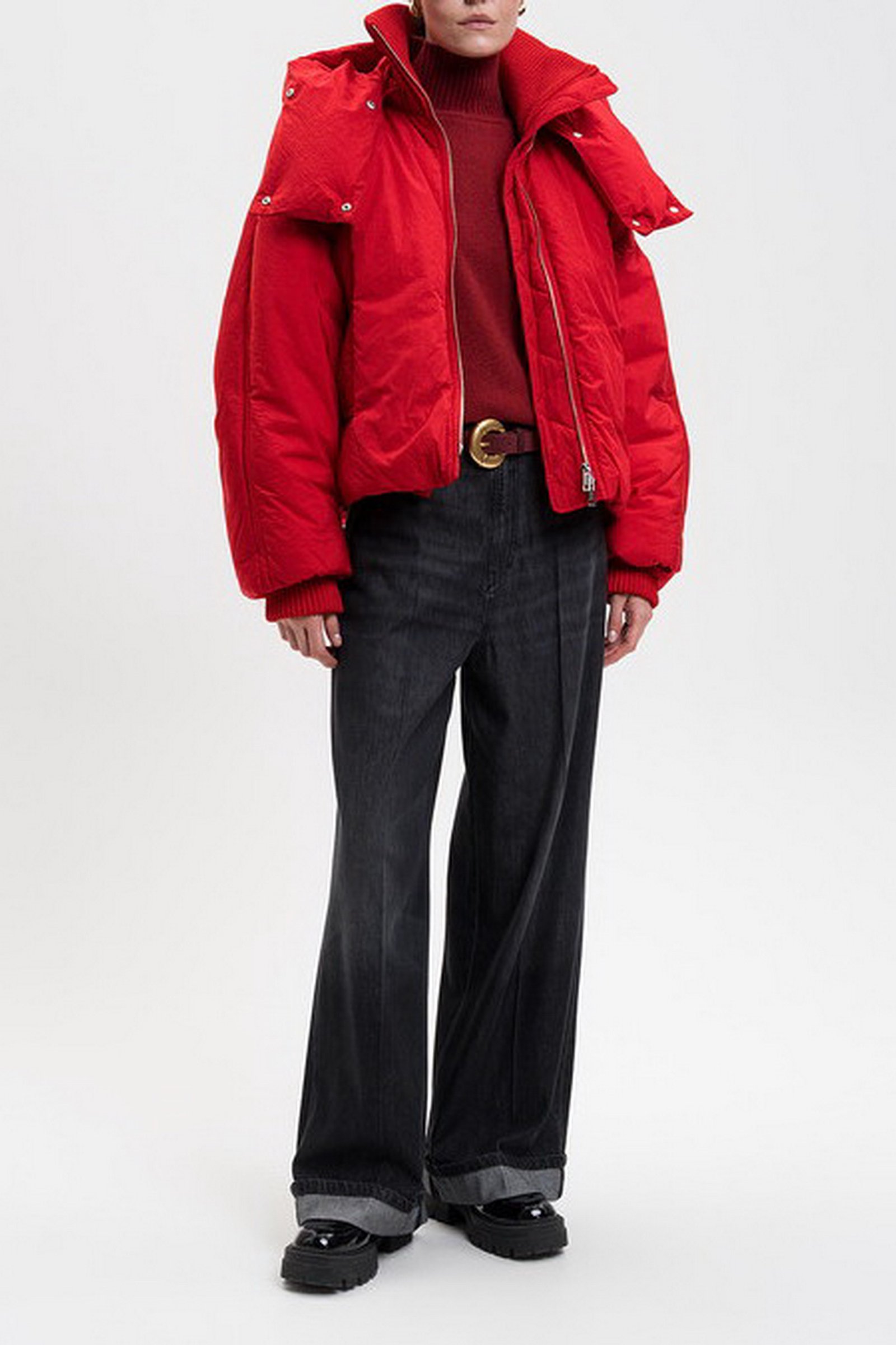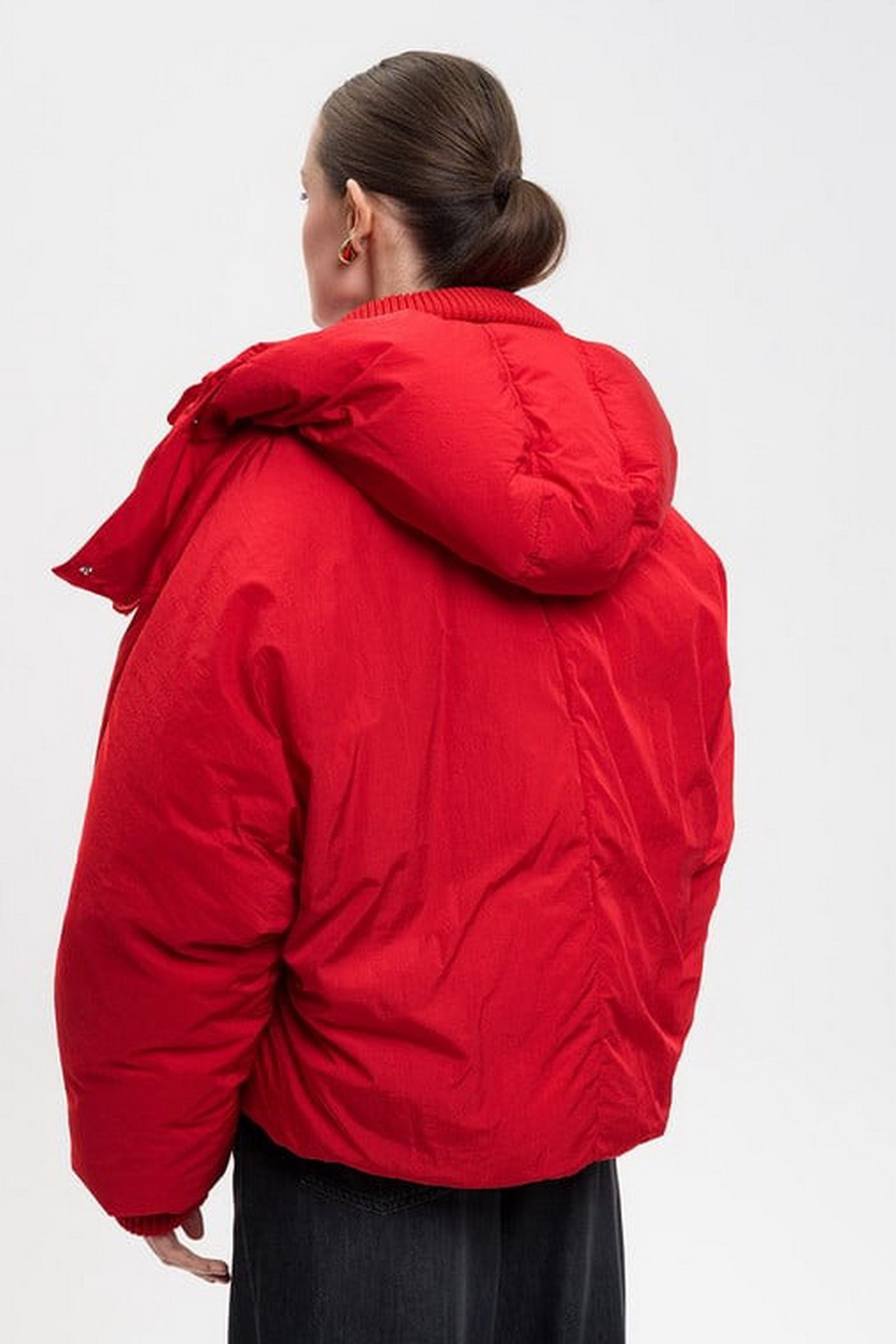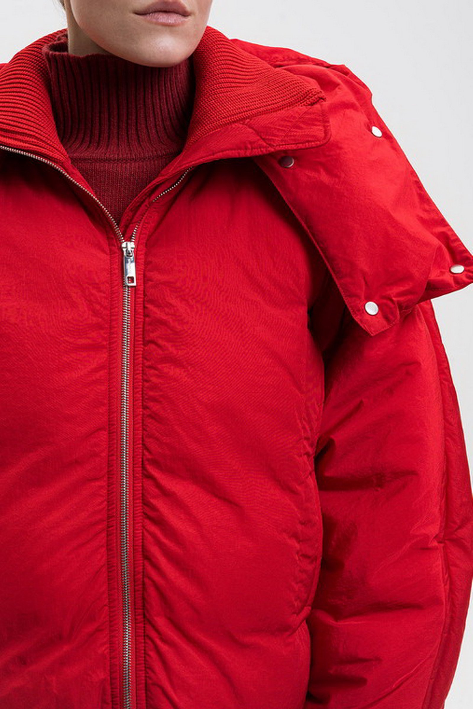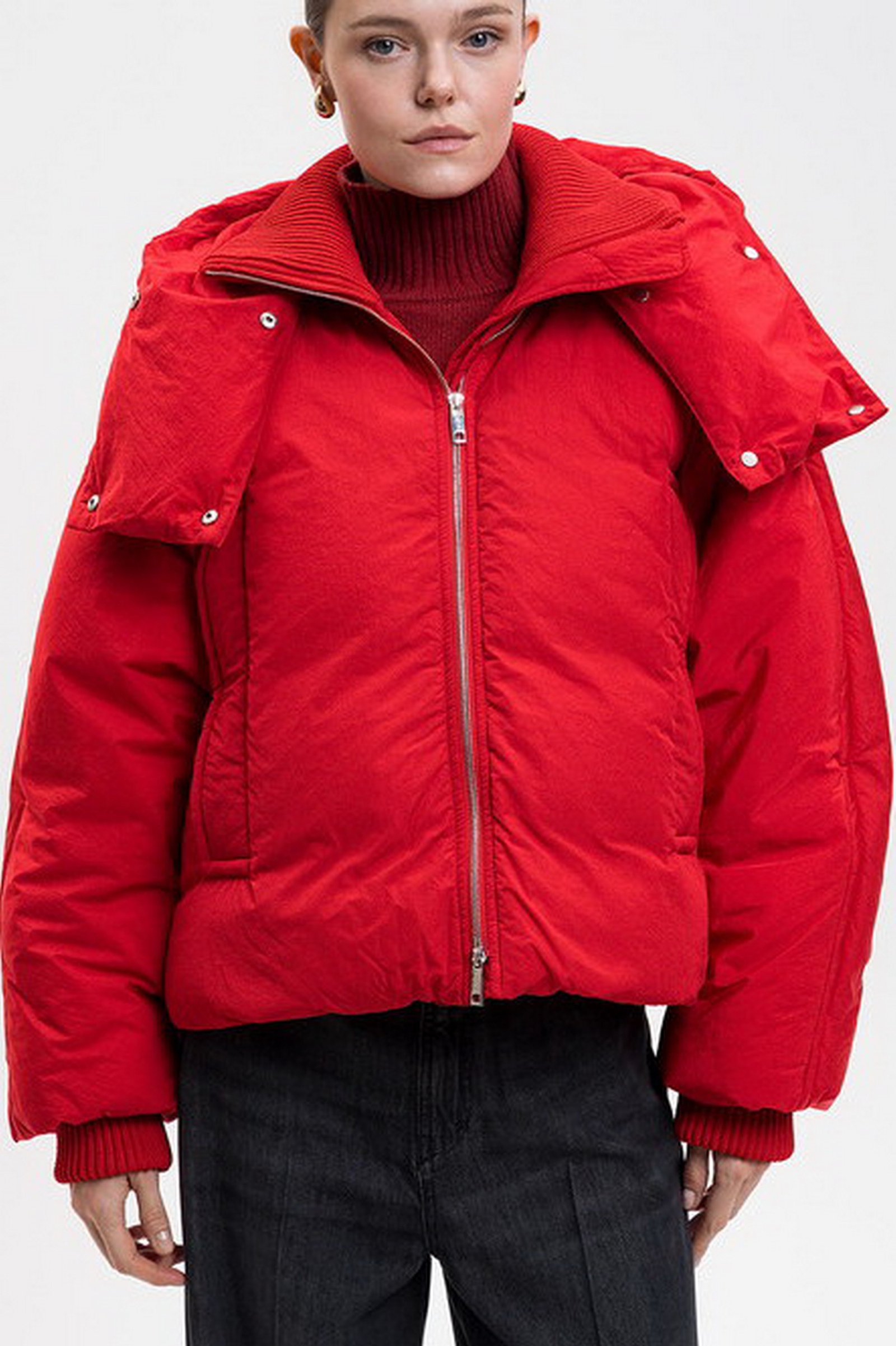 Piumino dal volume morbido, con lunghezza in vita. Realizzato in tessuto tecnico antigoccia, ha imbottitura in piuma d’oca e cappuccio rimovibile e richiudibile con bottoni a pressione.