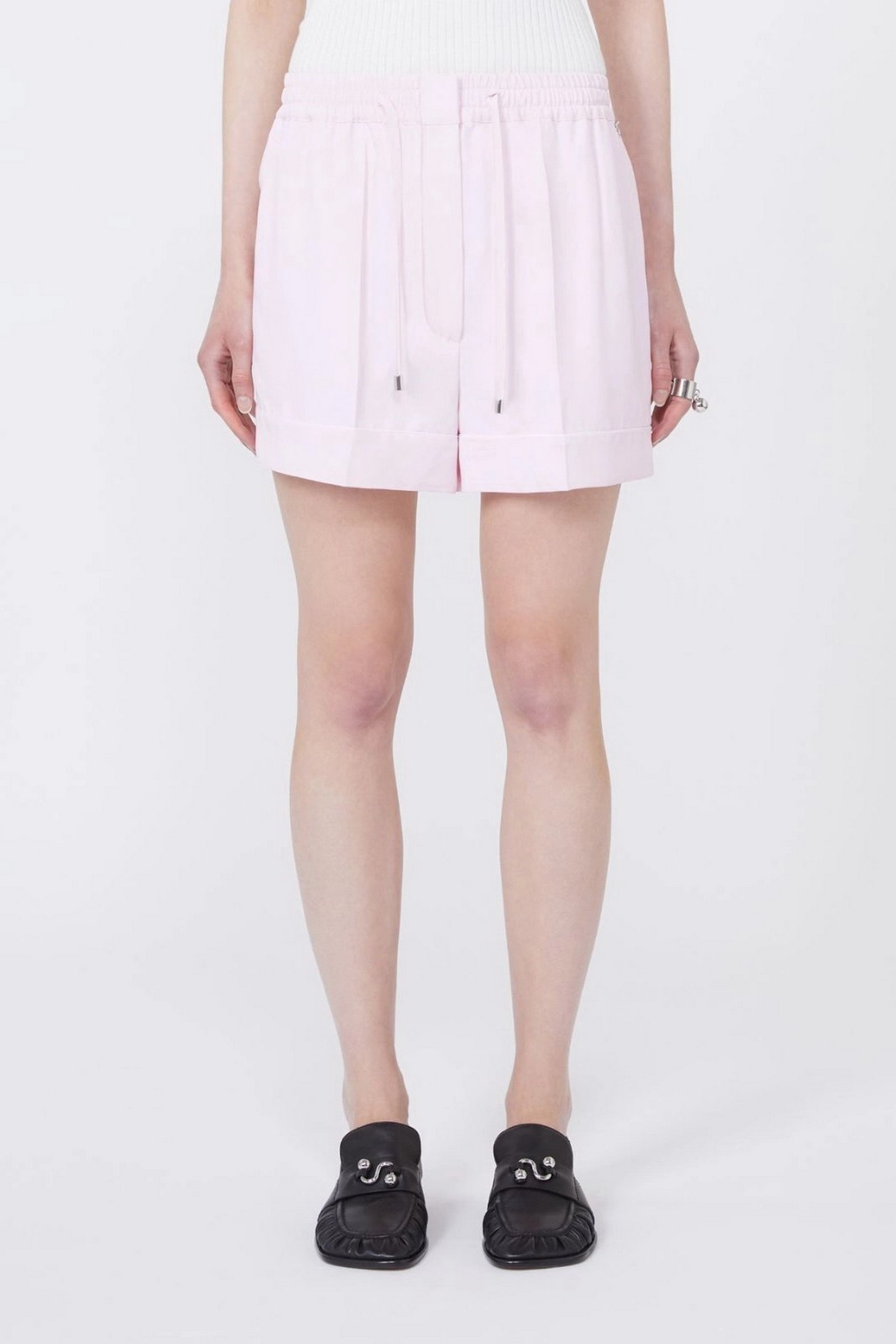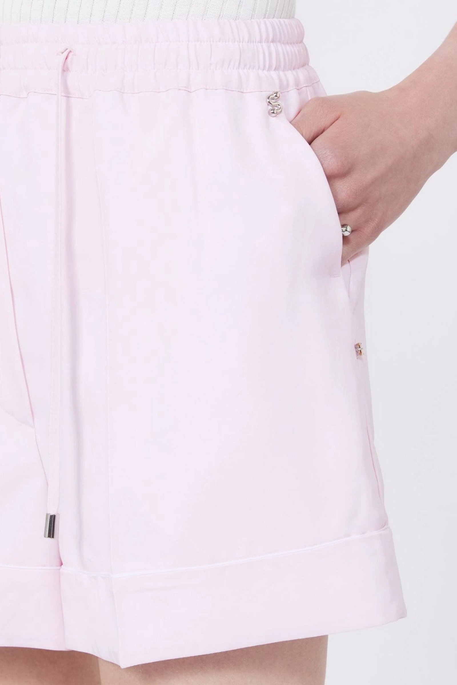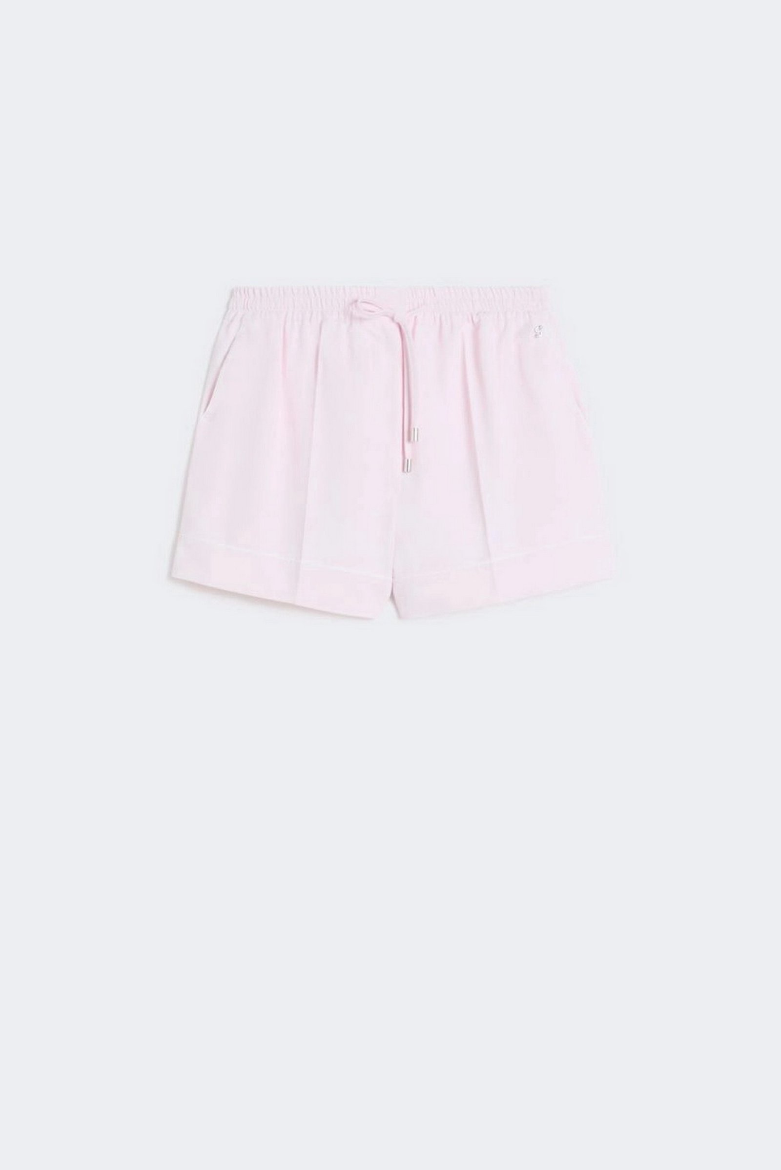 Shorts jogger realizzati in raso di viscosa lavato. I dettagli active come l’inserto elastico e la coulisse in vita si mixano a tocchi sartoriali come il piping a contrasto e le tasche di ispirazione maschile.