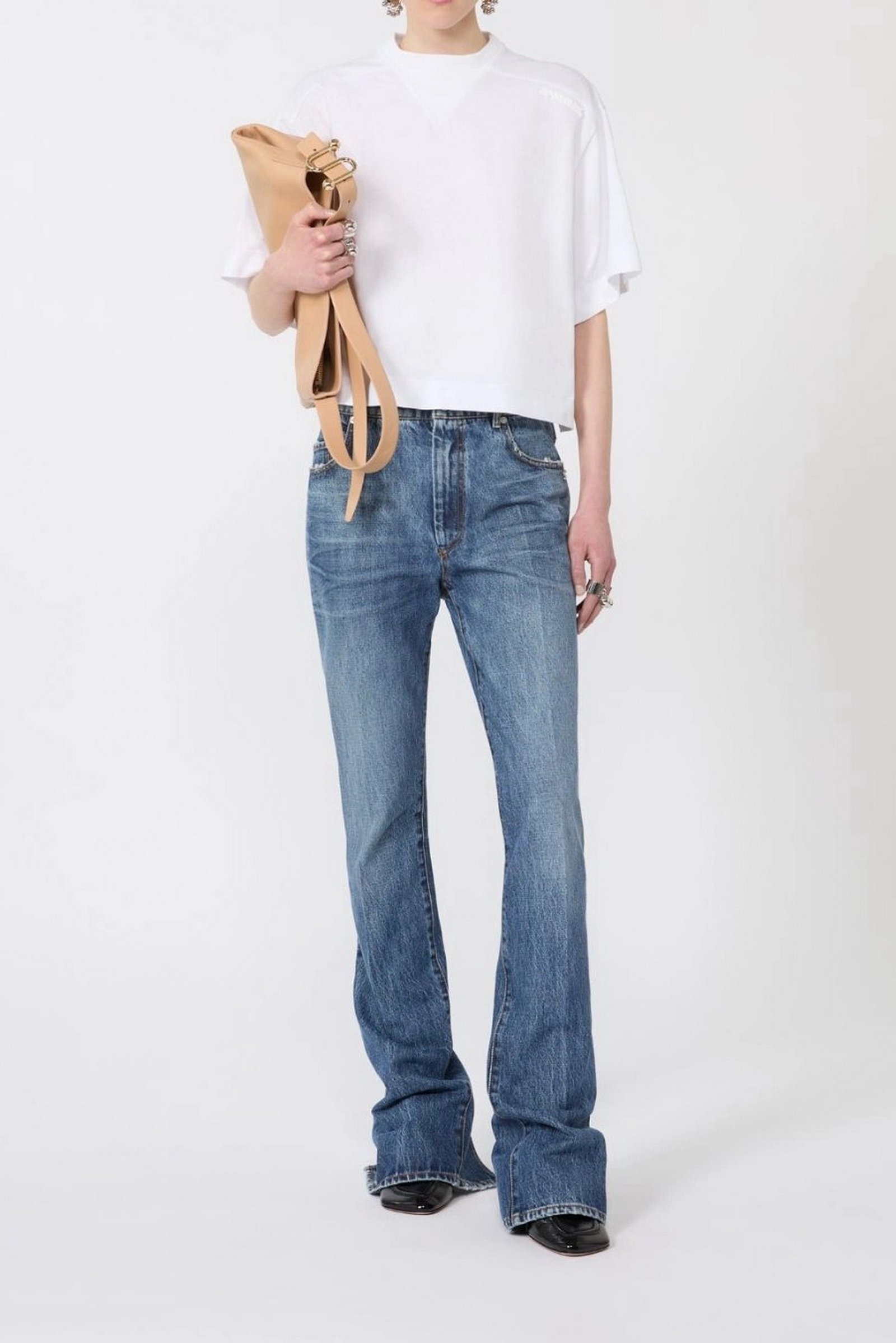 Evoluzione contemporanea della t-shirt boxy, con il tocco originale del collo a cratere enfatizzato dall’inserto a costine. Fit dritto sul busto con piccolo logo stampato on tone sulla spalla sinistra.